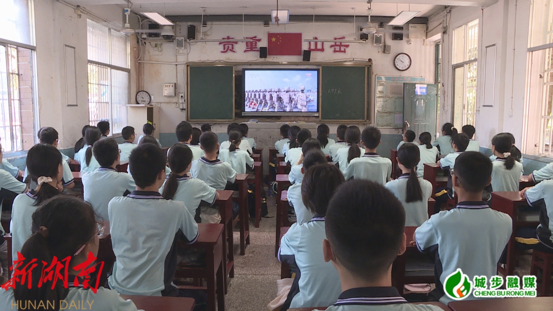 图为城步一中学生收看纪念大会和阅兵仪式