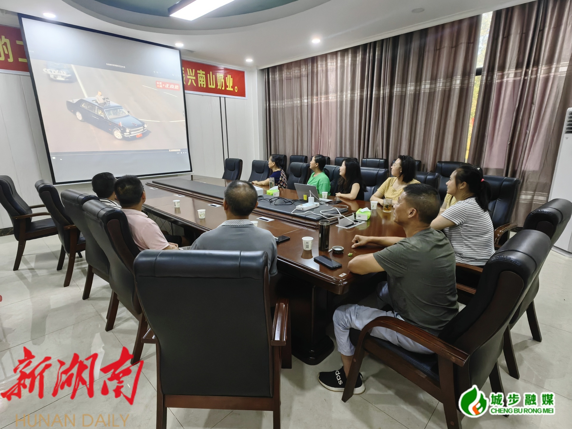 图为湖南南山牧业有限公司企业管理层和职工收看纪念大会和阅兵仪式