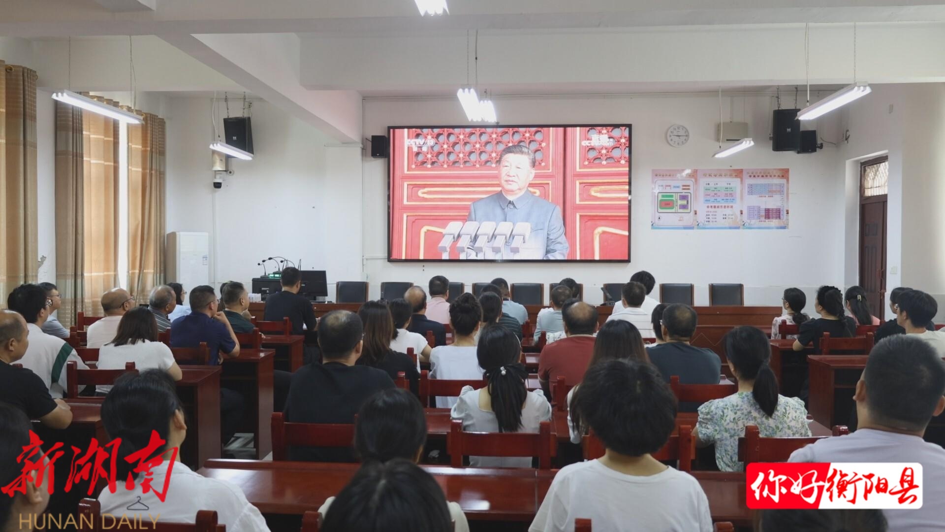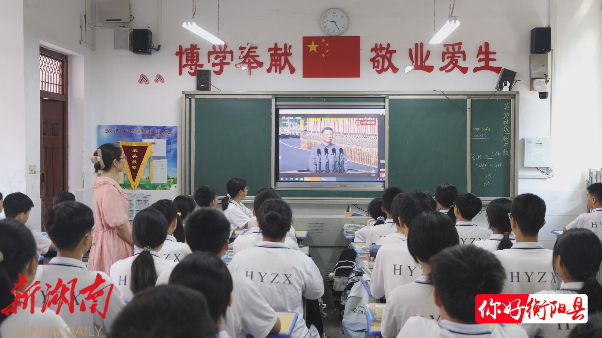 衡阳县融媒9月3日讯(记者:吕文煜) 9月3日上午,在弘扬中学,学校领导班子成员与教师代表在会议室共同收看纪念中国人民抗日战争暨世界反法西斯战争胜利80周年大会直播盛况,各班学生在教室内通过多媒体设备同步观看。