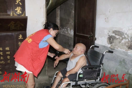 8月28日,邵东市恒泽养老服务有限公司的护理人员来到仙槎桥镇居民刘礼坤家中,为他测量血压、修剪胡须。刘礼坤因肢体残疾生活无法自理,被邵东市民政局列为特困人员照料服务对象,享受定期上门专业照护。“护理人员每周都来,特别贴心。”刘礼坤的姐夫罗昌忠感慨道。