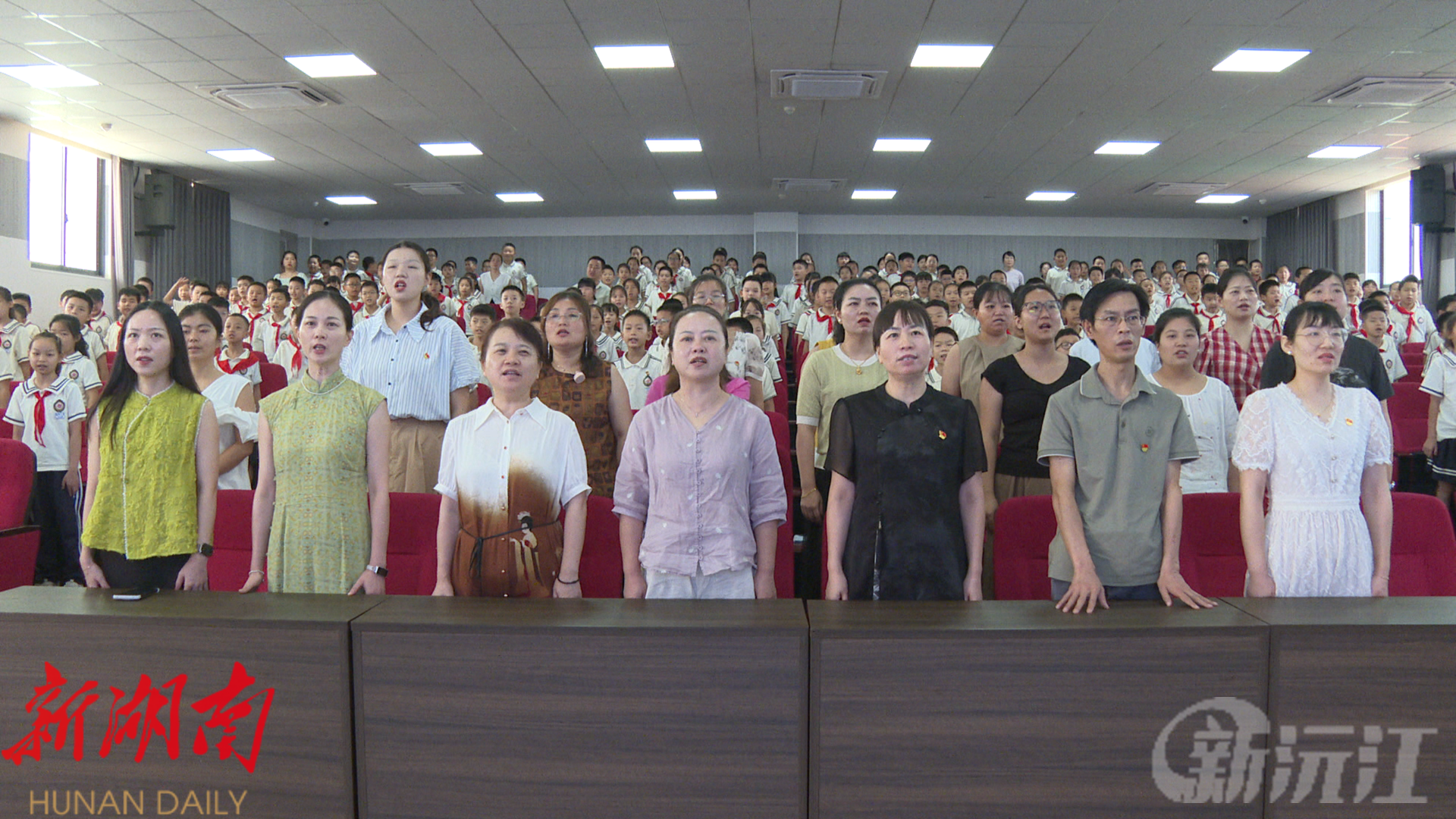 在芙蓉学校报告厅内,三百余名师生肃立观礼。当国歌响起,师生自发齐声跟唱,稚嫩的童声中饱含深情。学生们神情专注,用稚嫩的笔记写下自己的观后感言,爱国的种子在他们心中生根发芽。