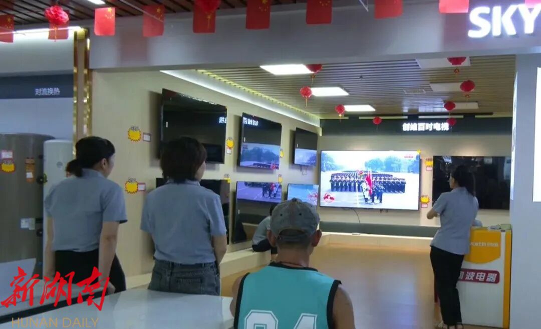 在澧源镇的一家商铺内,数名员工与顾客自发围坐在电视屏幕前,共同观看纪念中国人民抗日战争暨世界反法西斯战争胜利80周年大会直播。激昂的军乐、整齐的方阵步伐和先进的武器装备,让在场观众心潮澎湃。市民黎安华表示,“以前阅兵我都看了,都特别喜欢,看得好震撼,好激动。”