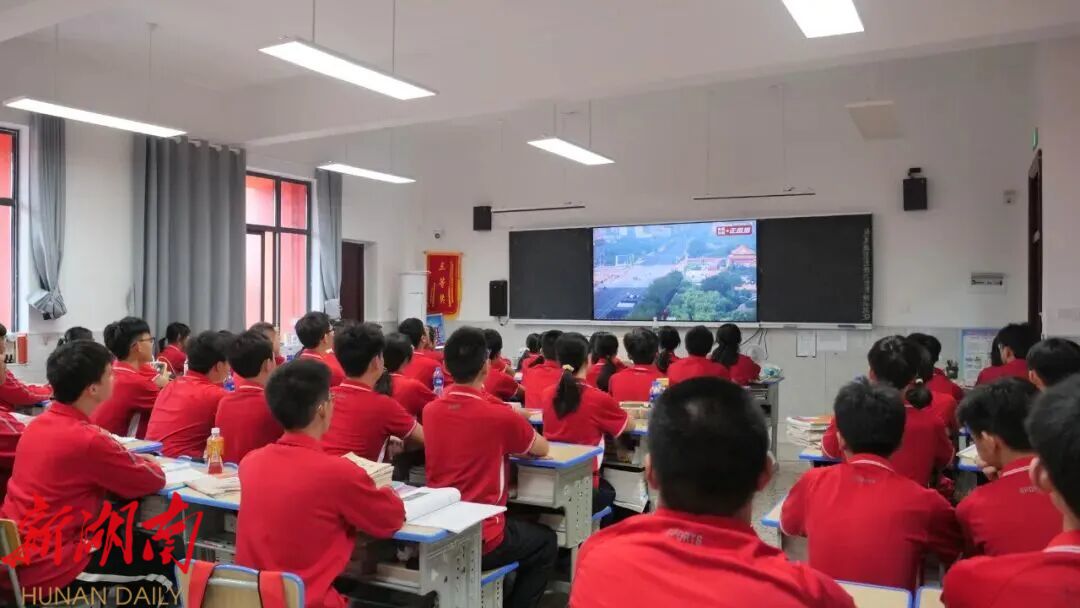 在贺龙中学的教室里,同学们通过多媒体设备同步收看纪念中国人民抗日战争暨世界反法西斯战争胜利80周年大会直播,观看每一个受阅方队的行进,沉浸在庄严盛大的阅兵氛围中。当新型主战装备方阵和空中梯队以磅礴气势通过天安门广场时,教室中不时传出轻声惊叹。贺龙中学学生郭振表示,“轰炸机出场时,我觉得很震撼!这些先进的武器装备,是国家科技进步的证明,作为新时代青少年,我们更要刻苦钻研,不辜负这份‘大国底气’。”