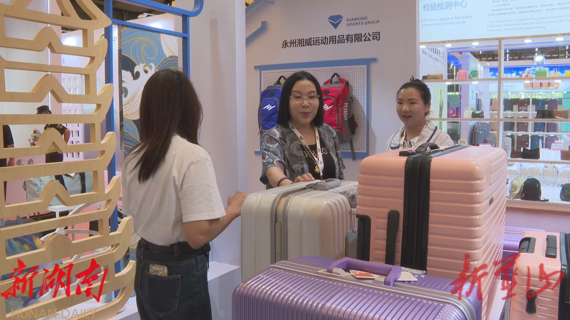 蓝山县参加展会的有湘江源皮具城、奇秀科技、嘉益皮具、湘威运动用品、尚亿源科技、新杭贸易等企业。在展会现场可以看到,展厅内人潮攒动,各式各样的皮具箱包整齐地摆放在展位上,工作人员热情地向采购商和参展嘉宾介绍各款产品的特点,同时还不忘通过手机与客商交换联系方式以便后续联系。