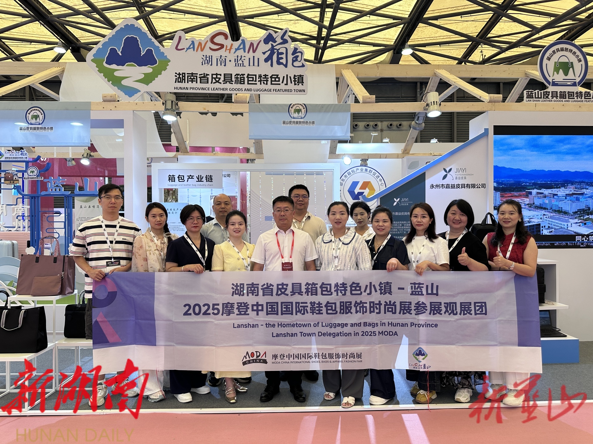 新蓝山客户端9月4日讯 (通讯员 王玉珏 廖琼君)9月3日,2025“摩登中国”国际鞋包服饰时尚展览会在上海新国际博览中心举行,蓝山县组织多家皮具箱包企业组团参展,免费为企业搭建展会平台,帮助企业实施“走出去”战略,进一步开拓国内外市场。中国轻工业联合会副会长、中国皮革协会理事长李玉中到蓝山县皮具箱包展厅参观。