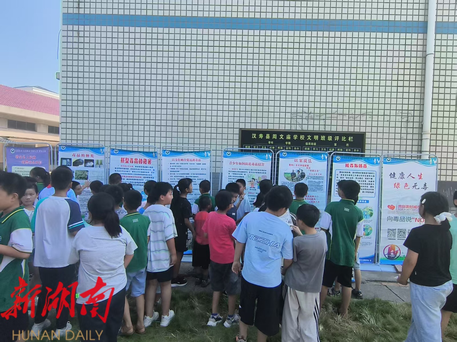 汉寿融媒9月5日讯 (通讯员:刘 霞)9月5日,汉寿县岩汪湖镇平安办、派出所、妇联、共青团等多部门联合走进周文庙小学,开展了形式多样的禁毒宣传教育活动。