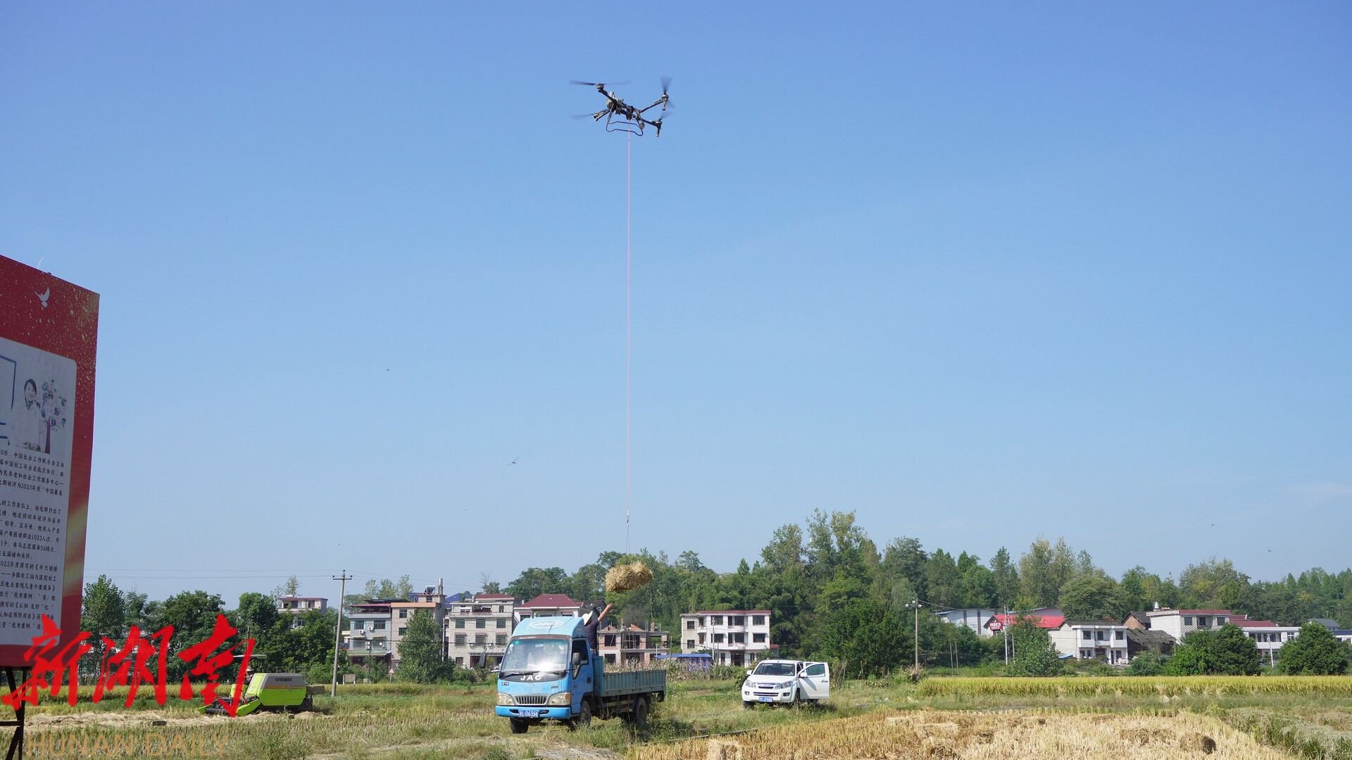 9月5日,记者在石江镇江潭村看到,打捆机在田间轰鸣,将散落的水稻秸秆迅速归集、压实、打成整齐的方捆或圆捆,随后,农技人员操作农用无人机将成捆的秸秆从田间运输到秸秆转运车上,这些成型的秸秆将被运往秸秆加工点,开启它们的“变身”之旅。