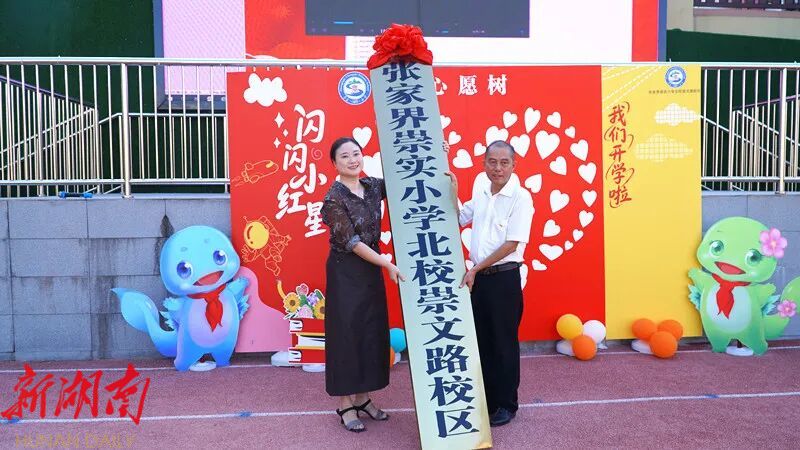 湖南日报·新湖南客户端9月5日讯(通讯员 刘娜 廖芯仪 李兴旺)9月4日,张家界崇实小学北校崇文路校区正式挂牌,并举行了以“童心映山河 开启新征程”为主题的开学典礼。