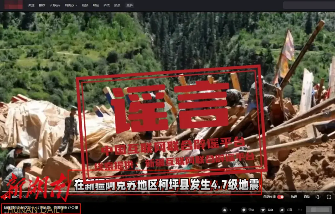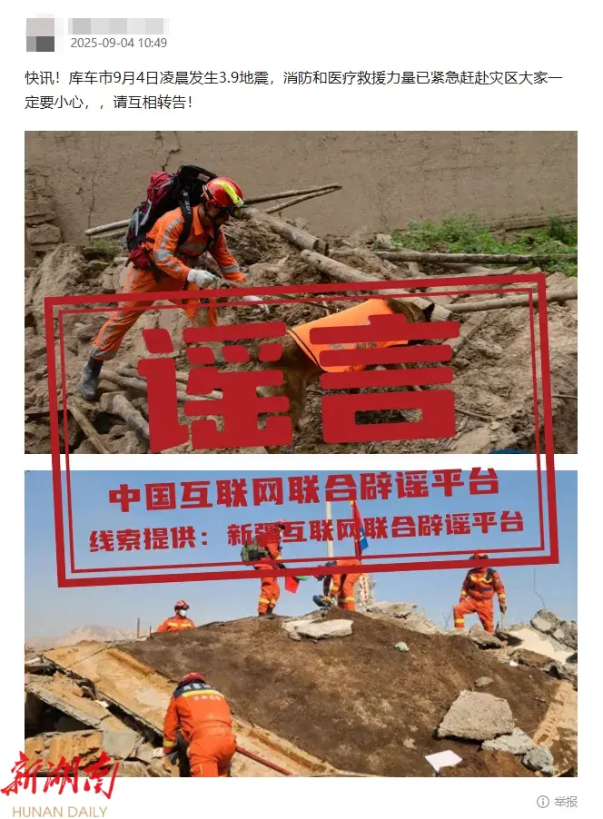 据中国地震台网消息,9月2日至4日,新疆阿克苏地区柯坪县、库车市、拜城县接连发生5起3.0级至4.7级地震。经核实,相关地震未造成人员伤亡和财产损失。部分自媒体用户为博取流量,罔顾事实,发布了与实际情况不符的地震废墟、房屋倒塌、抢险救援等图文信息,严重误导公众认知。网信部门提醒:请大家不造谣、不信谣、不传谣,切勿轻信或传播非正规来源、未经证实的地震信息,一切以官方发布为准。(来源:“新疆网络辟谣”微信公众号)