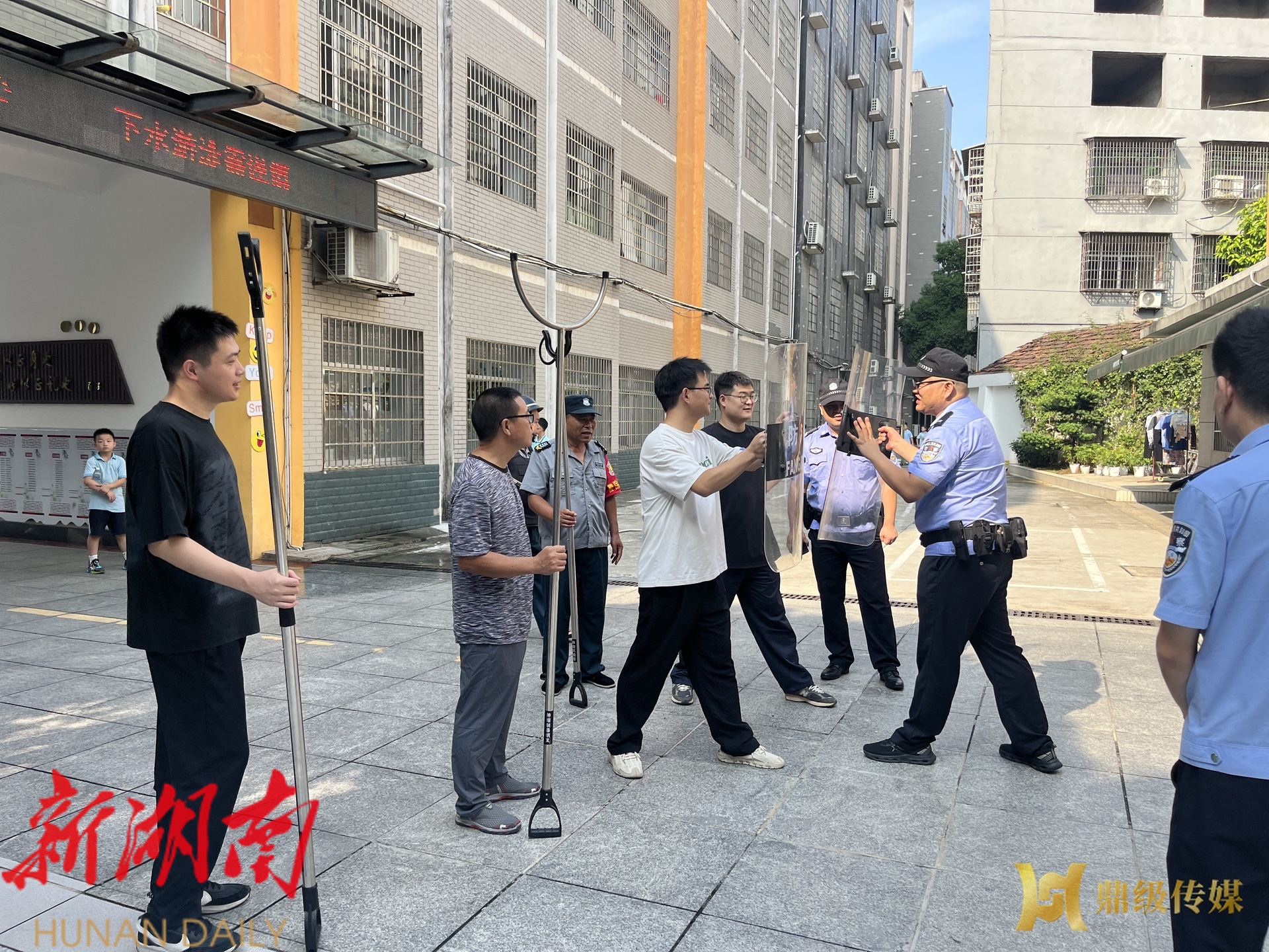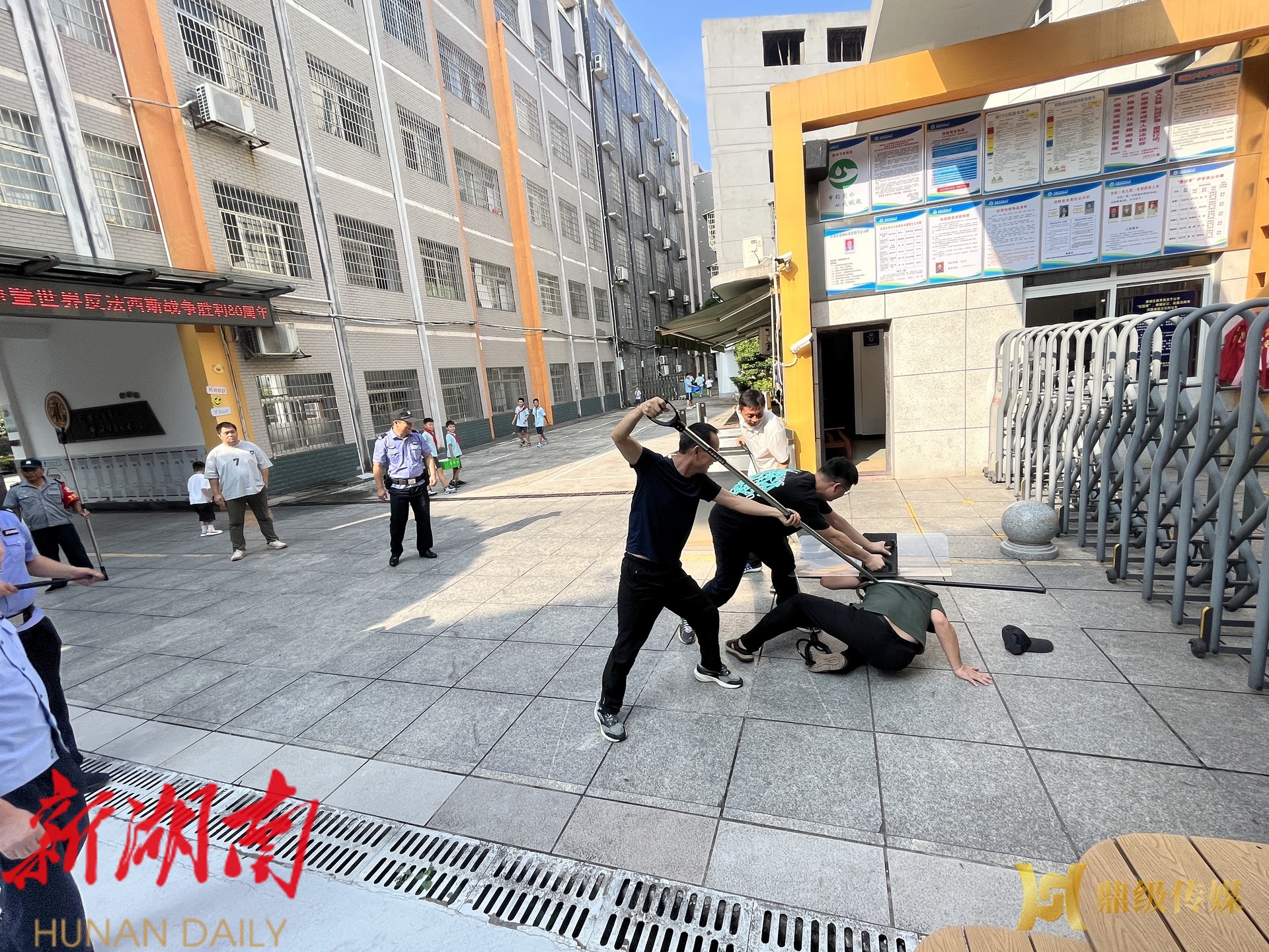 派出所民警对教师和安保人员就防暴器械使用、突发事件处置等进行了系统培训,并通过实际案例讲解应急分工与措施。在随后实战演练中,社区工作人员模拟“暴徒”持械企图闯入校园,学校保安人员马上按响一键式报警器,最小应急单元教师迅速反应、协同配合,成功将“暴徒”控制在校门外。