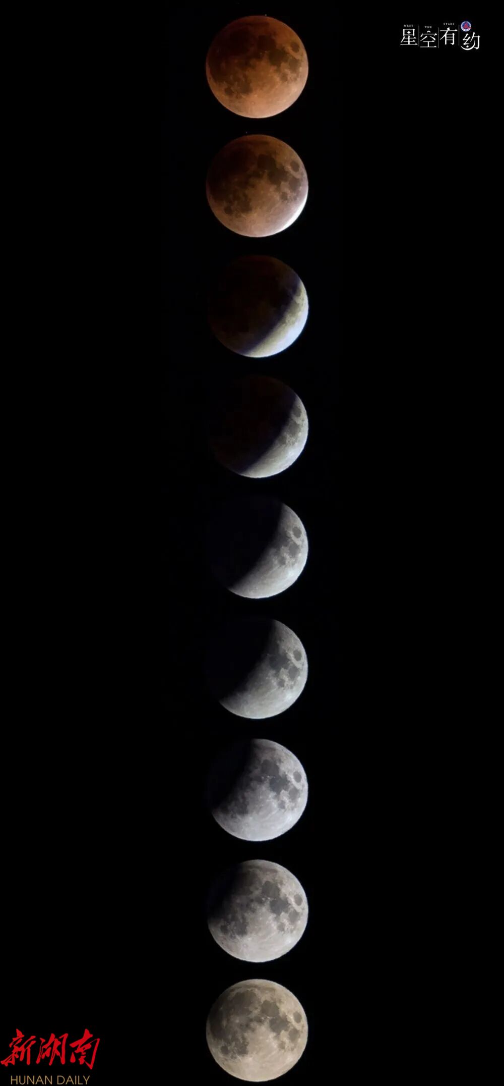这次月全食始于北京时间9月7日23时28分,此时月球开始稍微阴暗(半影食始);8日零时27分,月面开始有缺(初亏);1时31分,月球完全进入地球本影(食既);2时12分,月球的中心与地球本影的中心最近(食甚);2时53分,月球开始重现光芒(生光);3时56分,月球走出地球本影(复圆);4时55分,月食现象结束(半影食终)。其中,食既到生光为全食阶段,也就是民间俗称的“红月亮”,持续1小时22分。
