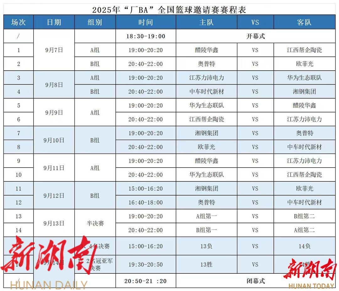 厂BA全国邀请赛为期8天,至9月14日结束。前6天为小组赛阶段,每天进行两场激烈对决。8支队伍分为两组进行循环赛,争夺四强席位。9月13日进行两场半决赛,9月14日晚进行冠亚军巅峰对决。跟常规赛一样,厂BA全国赛依然是免费观赛。