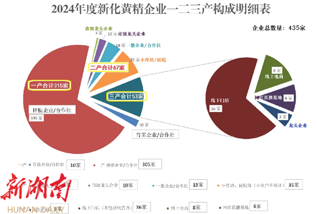产业融合创新上, 新化不断探索“黄精 + N”多业态发展模式,推出黄精河粉、黄精燕麦饮等创新产品,将黄精产业与食品、旅游、康养等多个产业深度融合,进一步延伸了产业链,提升了产业附加值。目前,全县已注册黄精生产加工企业、合作社共435家,培育市级以上龙头企业16家,其中省级4家、市级12家,线下专卖店与特产店星罗棋布,线上线下销售渠道不断拓展,销量连年跃升50%。