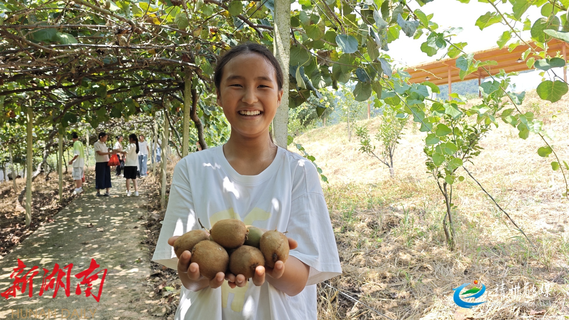学生们在劳动实践基地里采摘猕猴桃(蒲湘萍 摄)
