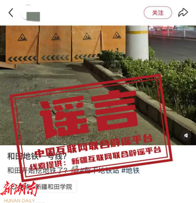 真相: 近日,有网民发布消息称“新疆和田要建地铁一号线?开始挖地铁了?”,并配以道路施工图片,引发关注。经和田市交通运输局核实,网传信息系谣言,截至目前,未收到任何关于和田市开挖地铁的工作通知或确认信息。(来源:“新疆网络辟谣”微信公众号)