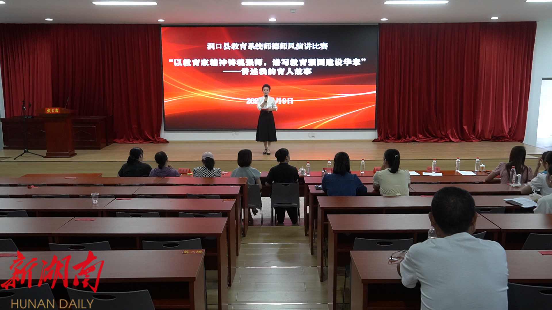 洞口融媒9月9日讯(记者:江京晟 通讯员:杨小波) 为热烈庆祝第41个教师节,深入贯彻落实立德树人根本任务,大力弘扬教育家精神,9月9日,由洞口县教育局、洞口县教育局工会联合会主办的全县教育系统“以教育家精神铸魂强师,谱写教育强国建设华章——讲述我的育人故事”师德师风演讲比赛在文昌街道第二小学举行。来自全县各中小学校的40名优秀教师代表齐聚一堂,用真挚的情感和动人的故事,分享育人心得,诠释师道初心。
