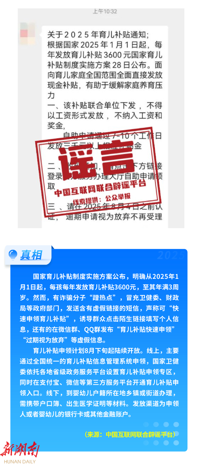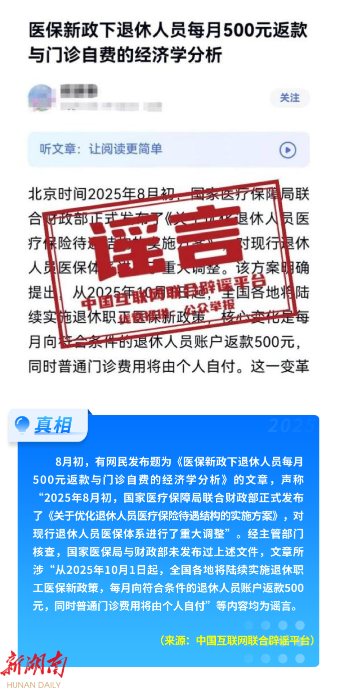 有自媒体发布“9月15日起开征‘房东税’”的消息,曲解《住房租赁条例》中租赁合同备案制度,违背《条例》规范租赁市场秩序的本质。所谓“医保新政下退休人员每月500元返款”,相关内容纯属虚构,混淆视听。还有不法分子编造“育儿补贴限时申领”等政策信息,冒充官方发送短信、设置链接,套取个人信息,严重侵害群众财产安全。