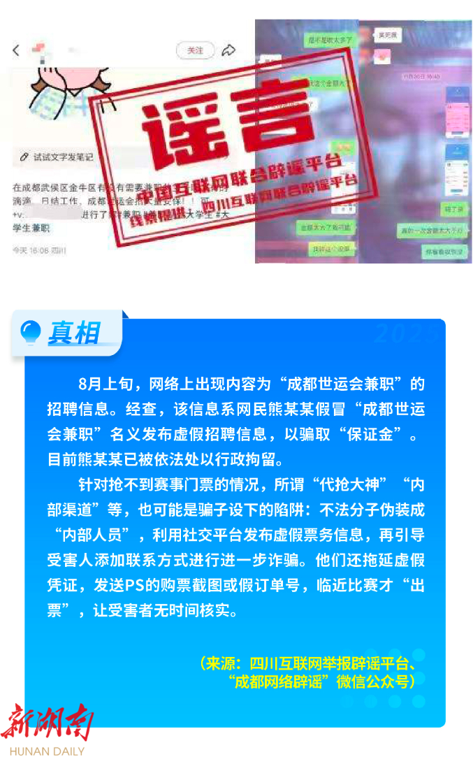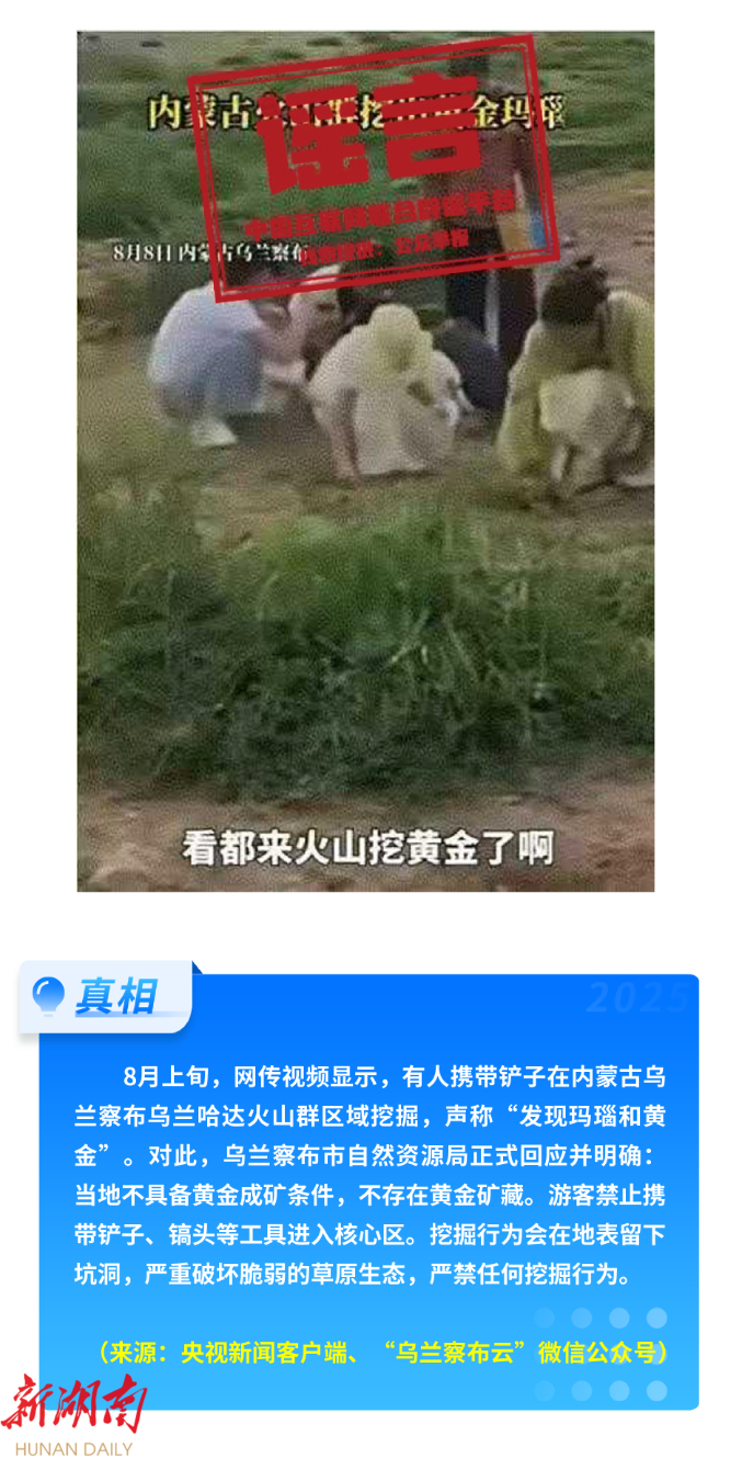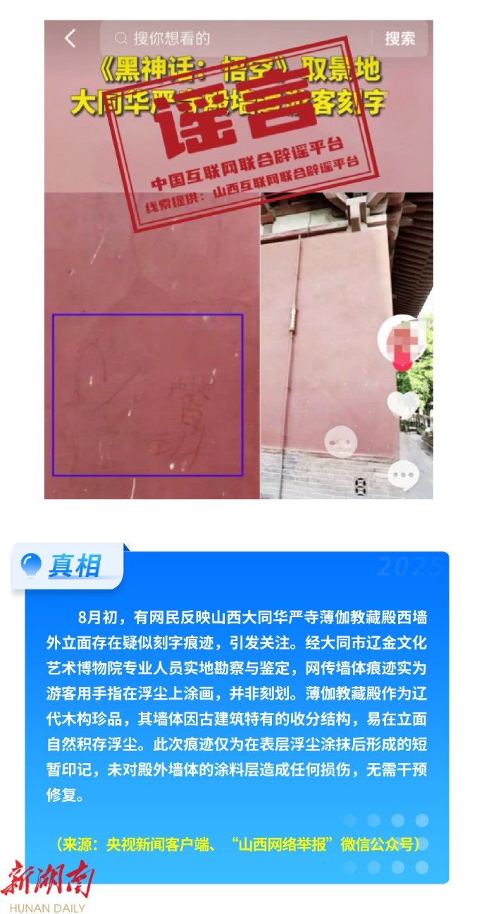 8月正值暑期,文旅消费旺,各类赛事多,相关谣言时有出现。“内蒙古乌兰哈达火山景区有黄金”虚假信息,误导游客违规挖掘,破坏生态环境;“山西大同华严寺殿墙遭游客刻字”传言,实为游客用手指在浮尘上涂画并非刻划。还有不法分子编造传播“成都世运会招募兼职,需交‘保证金’”“世运会内部票”“大神代抢”等信息,假冒官方名义实施诈骗,侵害公众权益。