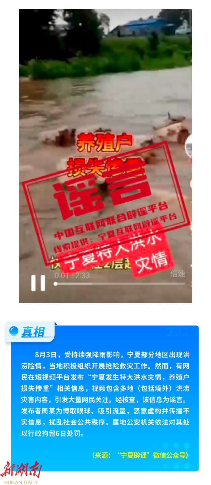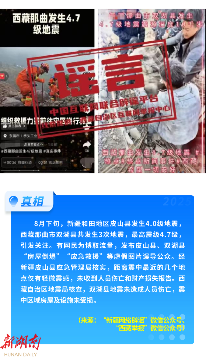 近期,涉汛情、险情谣言多发。有人利用AI编造“海啸来袭,数十万上海市民正排队登车”“上海30万居民通过大巴和高铁分流至苏州、无锡”等耸人听闻的谣言,扰乱社会秩序。“宁夏发生特大洪水灾情,养殖户损失惨重”“甘肃天水大雨积水淹没道路车辆”,以及“新疆和田皮山县、西藏那曲双湖县地震致人员伤亡、房屋损坏”等谣言,通过拼接剪辑灾情视频、虚构伤亡情况等,引发公众恐慌,造成恶劣影响。