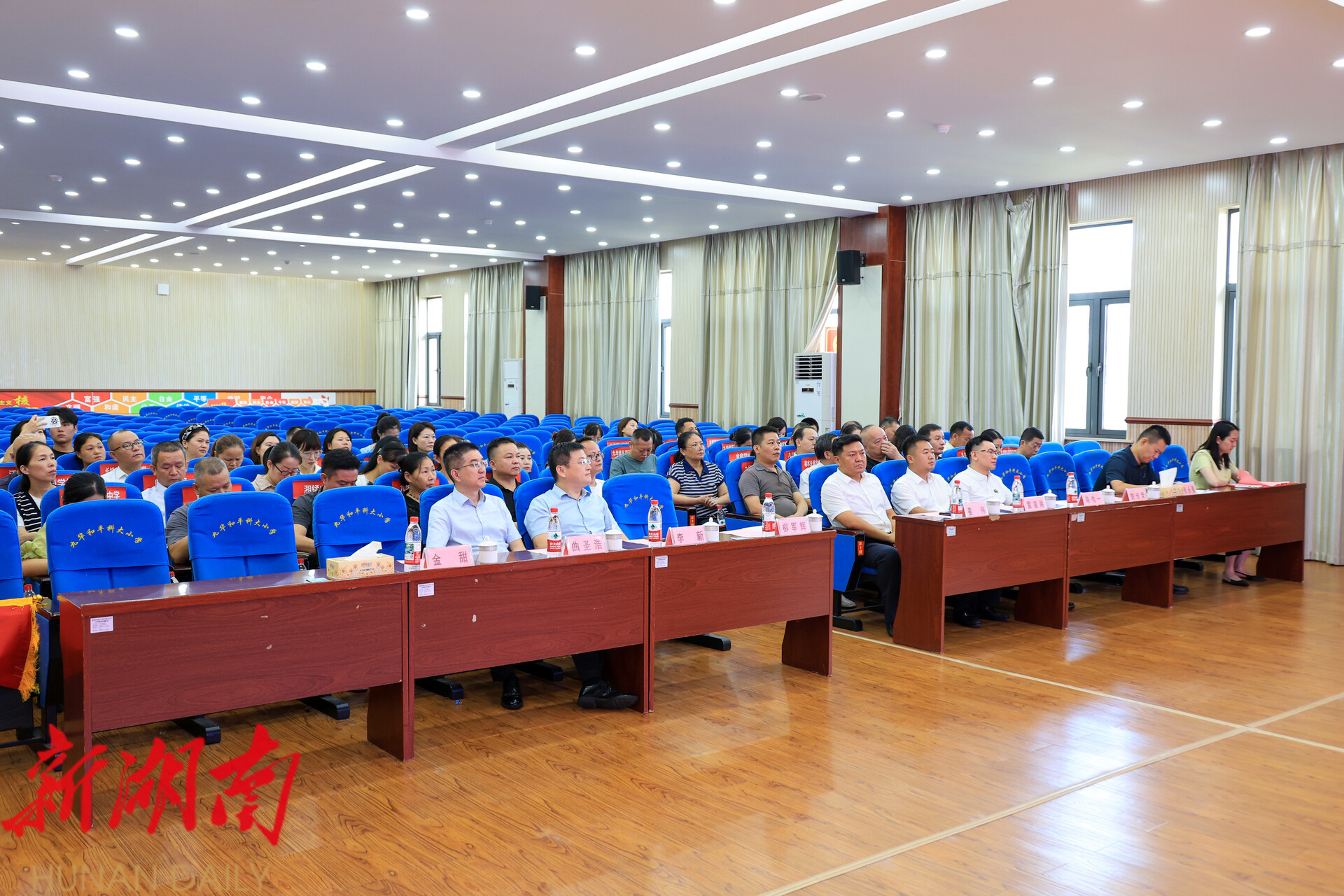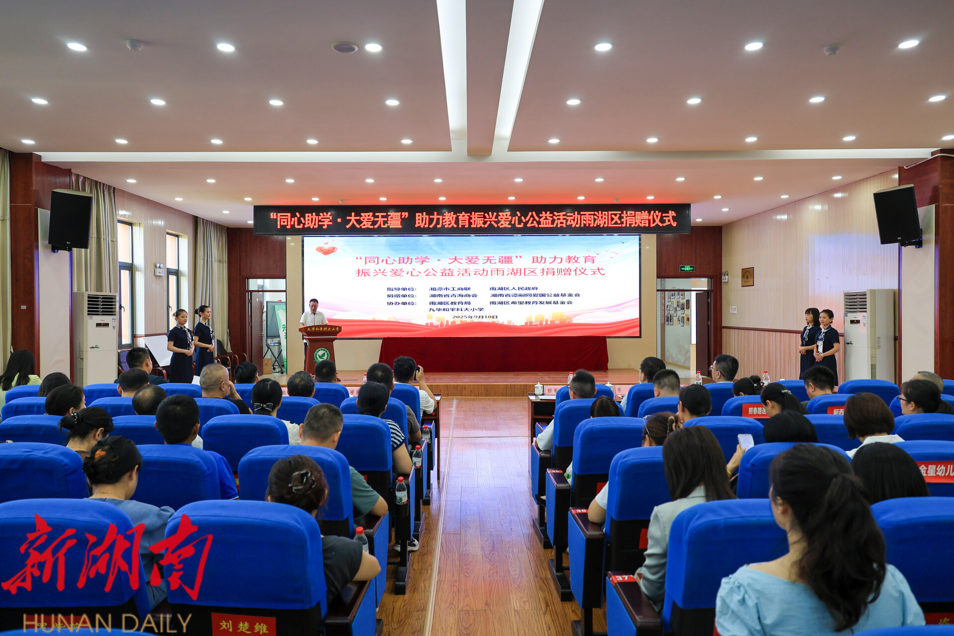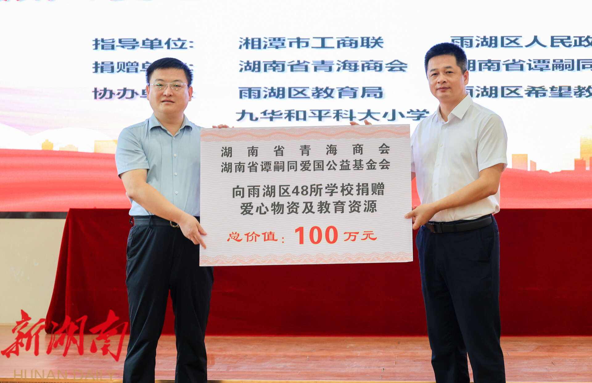 湖南省青海商会秘书长李新、湖南省谭嗣同爱国公益基金会监事长曲圣浩,区教育局主要负责人,48所受赠学校的校长一同参加活动。