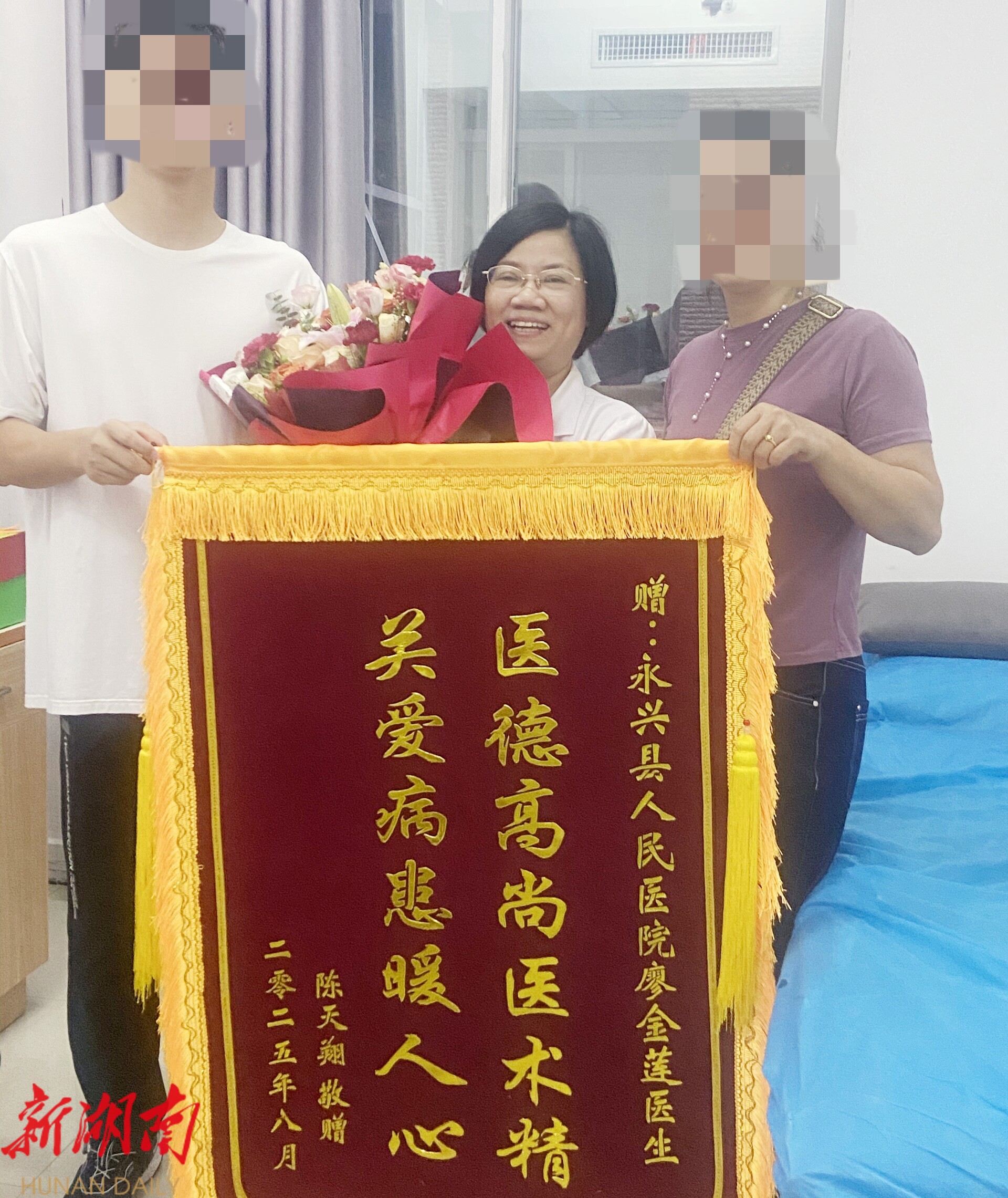 18年后的这个秋天,曾经危在旦夕的宝宝已经健康成长为一名青年,并以优异的成绩考取南华大学。在开启大学新生活之前,他在妈妈的陪伴下专程回到永兴县人民医院,手捧鲜花与锦旗,向当年挽救他生命的廖金莲医生表达深深的感激之情。
