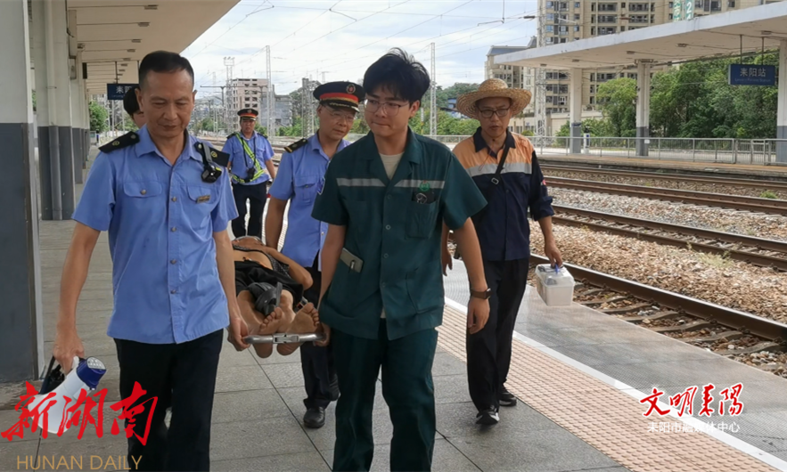 13时18分,K769次列车在耒阳火车站一站台5道停稳。13时19分120医护人员到达,为便于施救,车站工作人员与列车工作人员合力将这名旅客转移至空旷的站台上。见此情况,医护人员立即进行简单救治。与此同时,陈列伟迅速与列车长办理交接,将旅客的详细信息、发病情况一一记录。13时23分,K769次列车正点驶离耒阳火车站。