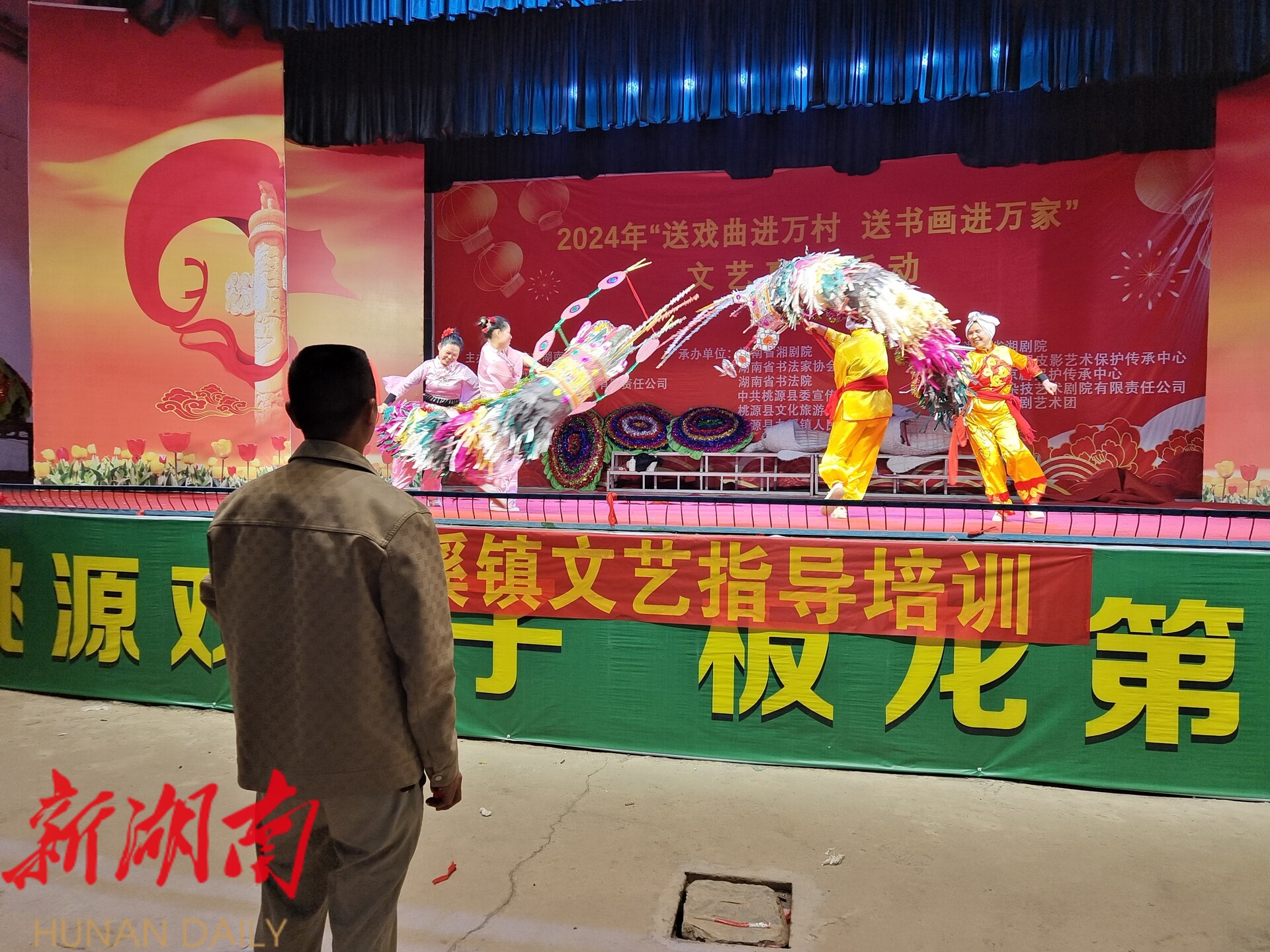 在文化实践的版图上,杨万胜编织的经纬日益细密。他建立“老带新”传承机制,让车儿灯、虾灯、鹬蚌灯等技艺在年轻演员中焕发新生,年均培养青年演员30余人次,每年还吸引湖南文理学院艺术系师生代表前来交流学习。他还带领团队创作文艺作品积极参与社会建设,如方言小品《三胎风波》紧扣生育政策宣传,《拒宴》以传统戏曲形式诠释反腐倡廉,方言小品《要帮你就大胆帮》弘扬社会美德,这些作品在“送戏下乡”中潜移默化地发挥着教化功能。2024年,九溪新汉剧团入选文化和旅游部评选的全国“百团汇演”优秀群众文艺团队,这份国家级荣誉背后,是杨万胜将艺术追求升华为社会责任的自觉实践。