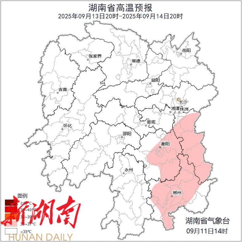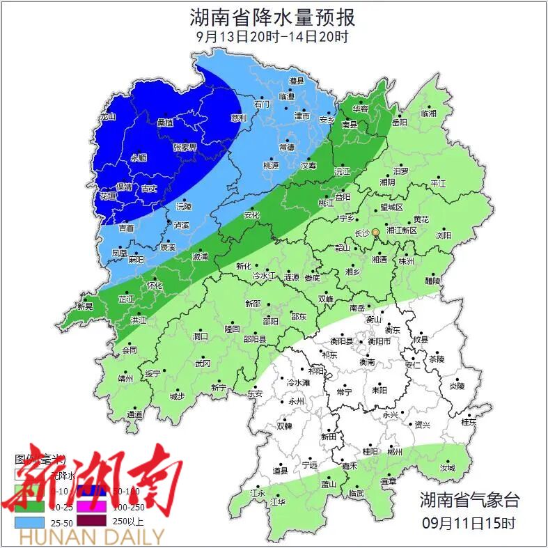 13日晚上至14日白天 ,湘中以北阴天有小到中等阵雨或雷阵雨,其中湘西北部分地区大雨,湘西州中北部、张家界、 怀化北部局地有暴雨,其他地区多云,湘东南局地有阵雨或雷阵雨;南风2~3级,雷雨时局地阵风7~9级;最高气温湘南33~36℃,其他地区28~32℃,最低气温23~27℃。