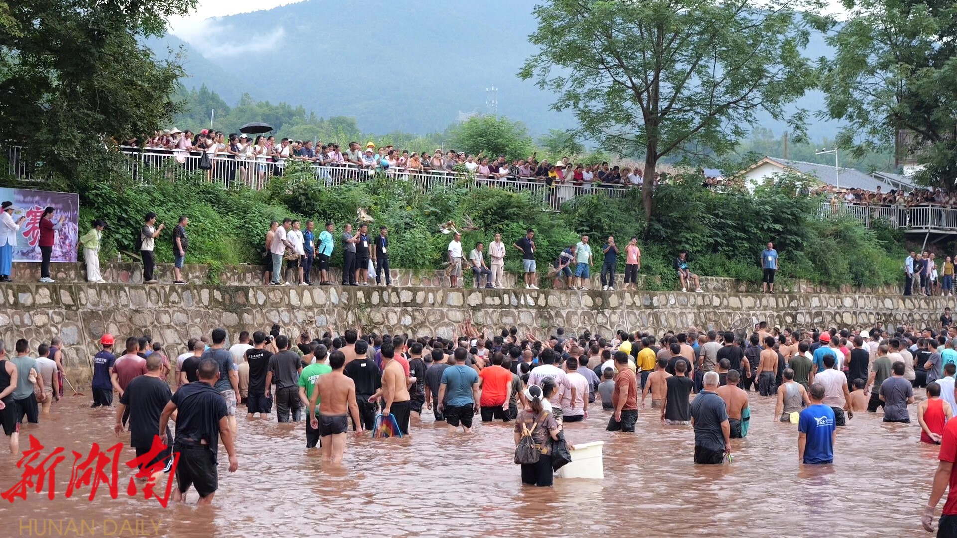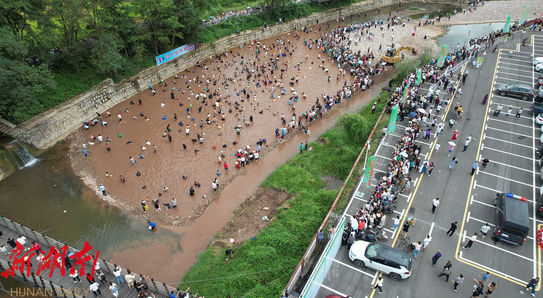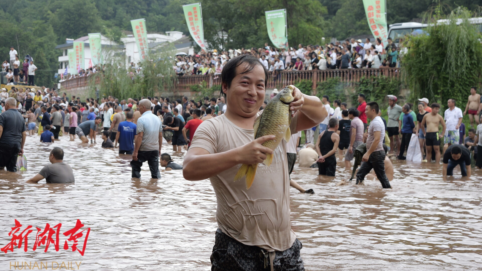 湖南日报·新湖南客户端9月12日讯(通讯员 肖君 郭军)9月12日,桑植县民歌寨村歌赛暨陈家坪“七月二十一”赶会火热进行中!河道中,两千斤鲜鱼与八十只鸭子“疯狂输出”,村民和游客秒变“捕鱼达人”“抢鸭高手”,现场水花四溅、欢呼不断——这场面,够野!够欢乐!