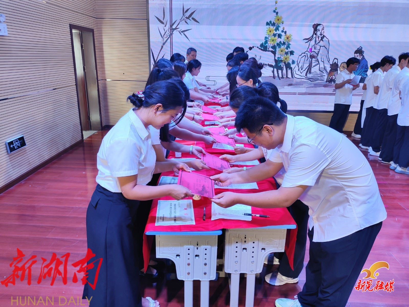 当天,芙蓉学校小学、初中两部共28对指导教师与青年教师成功“牵手”。校领导为指导教师颁发聘书,一本本聘书承载着学校的信任与指导教师的责任;青年教师则以传统敬茶礼向指导教师表达拜师诚意,一鞠躬、一敬茶间,满是对前辈的敬重与求知的渴望。