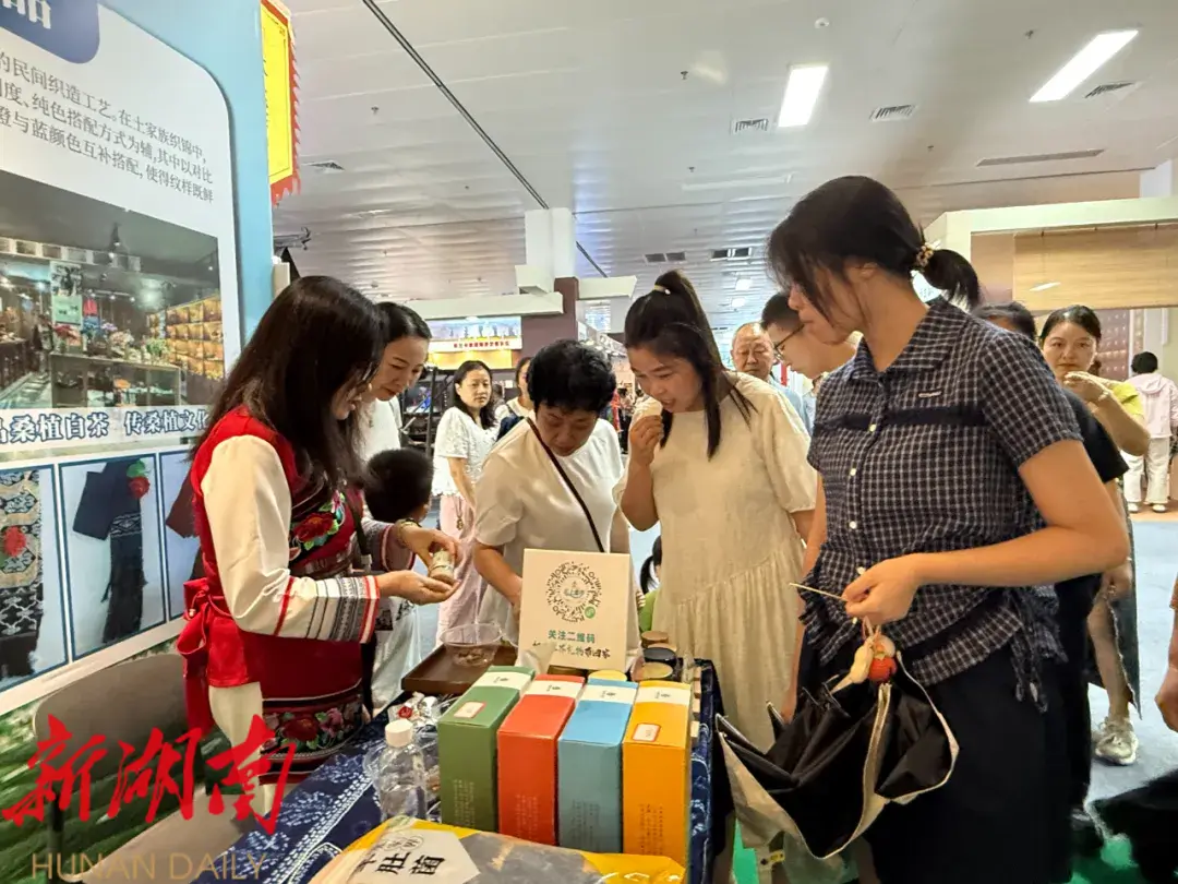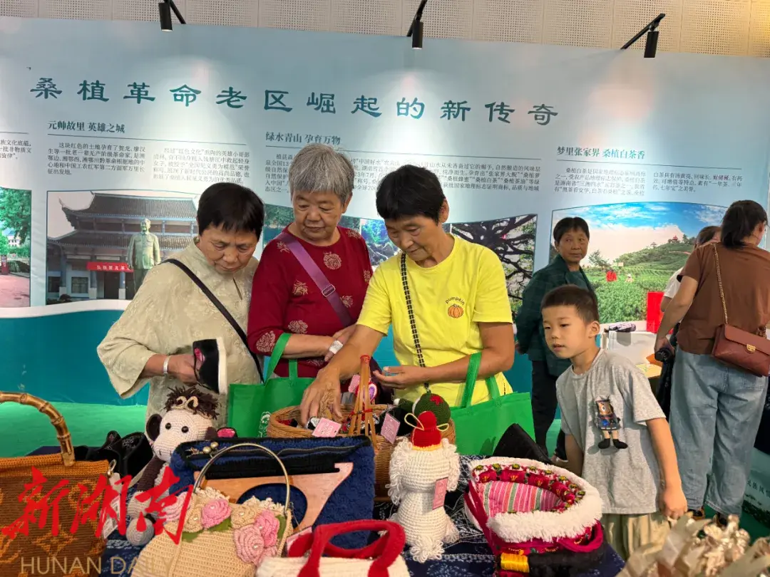 在桑植旅游商品展馆前,身着土家族和白族服饰的工作人员向过往市民和游客推荐桑植农特产品,并热情邀请大家免费品尝特色腊肉和特色小吃。展台上,桑植白茶、桑植茶油、桑植蜂蜜、桑植魔芋、羊肚菌、葛根粉、霉茶、大鲵零食等商品琳琅满目,独具民族特色的土家织锦、手工布鞋、手工编织包等吸引大家纷纷驻足。