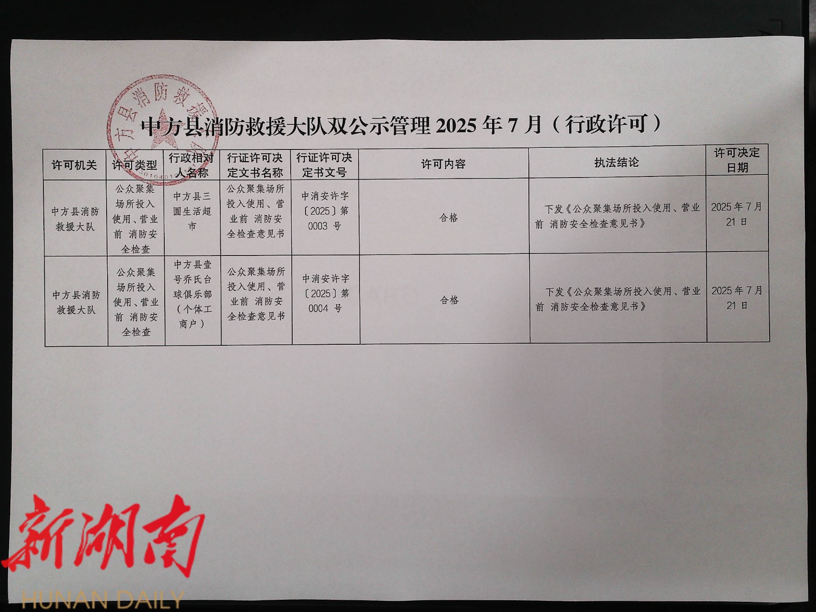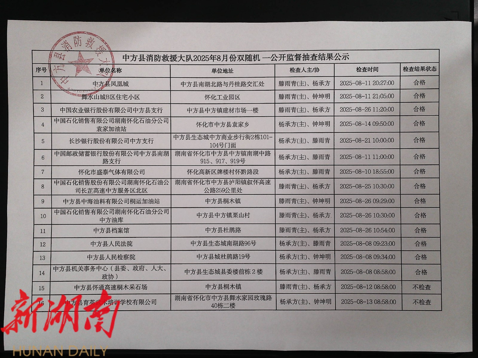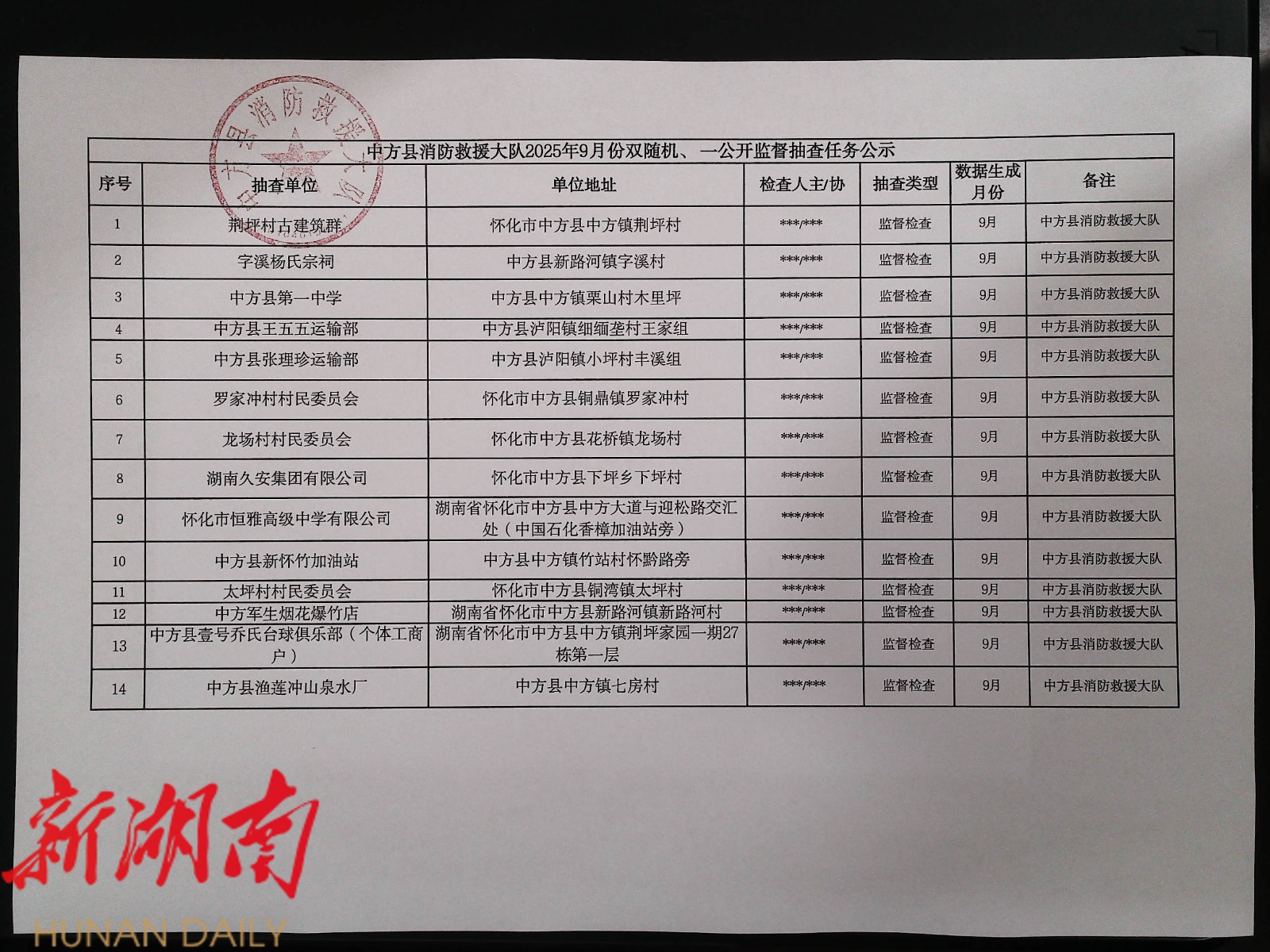 中方县消防救援大队“双随机、一公开”监督抽查任务公示(7月行政许可、8月结果、9月计划)