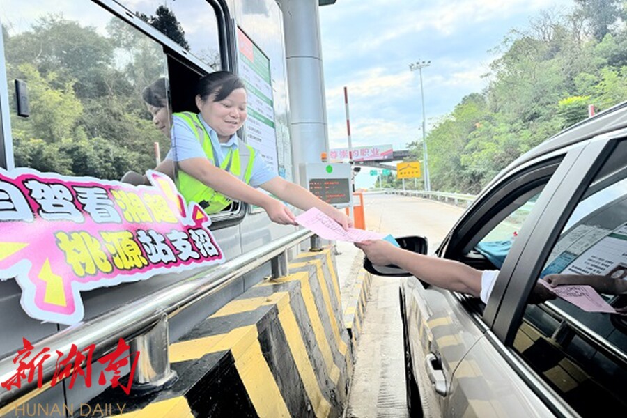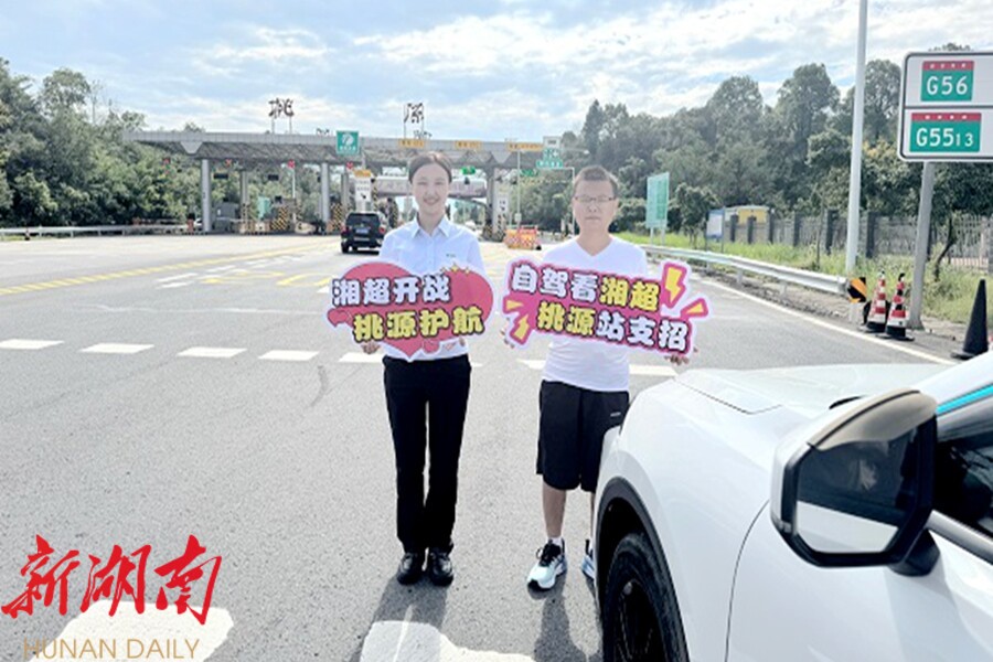 9月12日,在湖南高速集团常德分公司桃源中心收费站, “路灯” 志愿者举 着 “湘超开战 桃源护航 ” 的粉色手牌,热情地为自驾前往郴州观赛的陈先生指引方向。陈先生笑着晃了晃手机里的赛事预告,眼里满是惊喜:“刚跟 女朋友 念叨常德队的粉袍好看,没想到收费站先玩起 了‘ 同款浪漫’,太出圈了!”