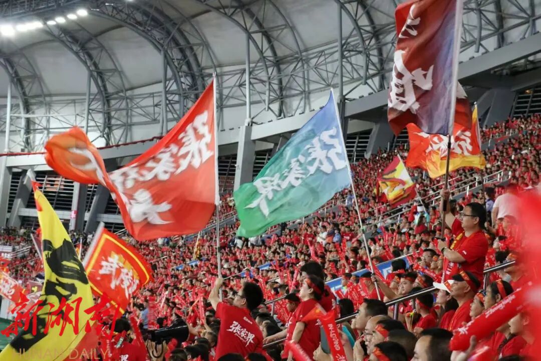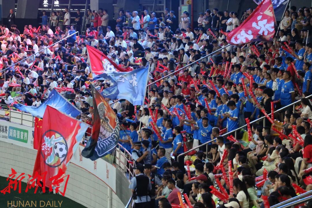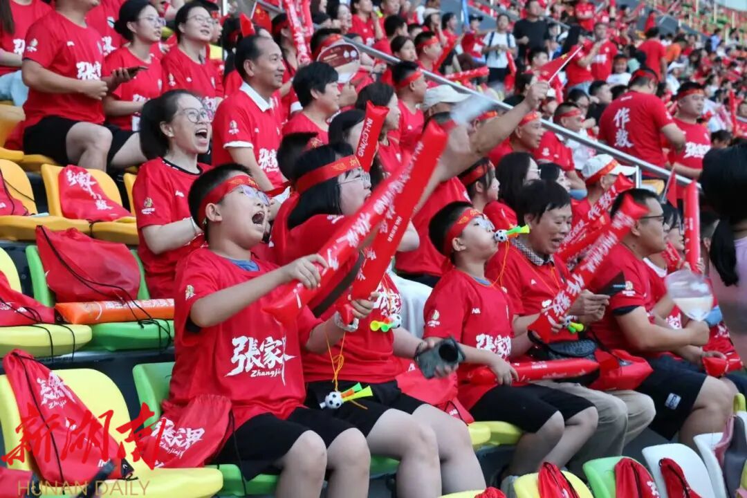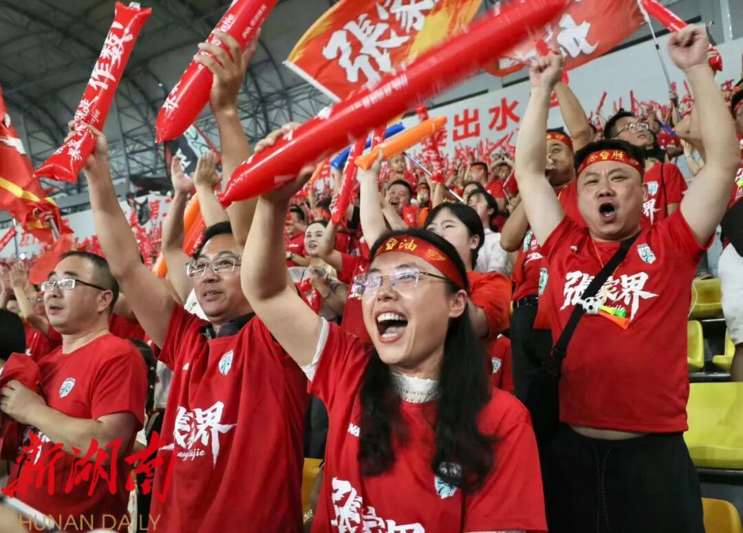 “张家界加油”的旗帜在看台间挥舞如浪