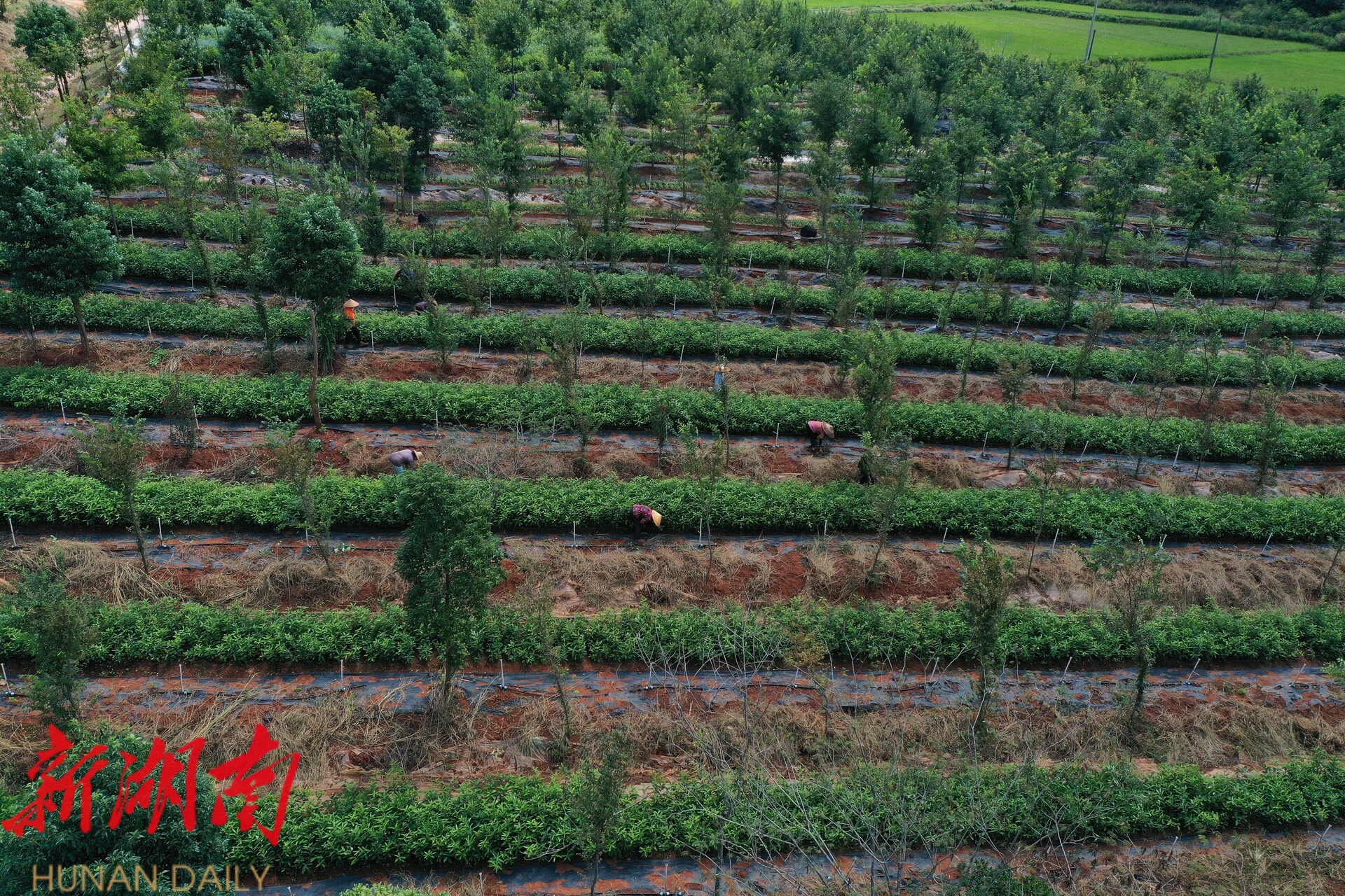 在樟市镇山河村油茶种植基地,5700余亩油茶郁郁葱葱,再过一个月将进入油茶收获期。种植园里,油茶林下玉竹、黄精等中药材作物长势喜人,工人们正忙着除草施肥,对林下作物进行养护。