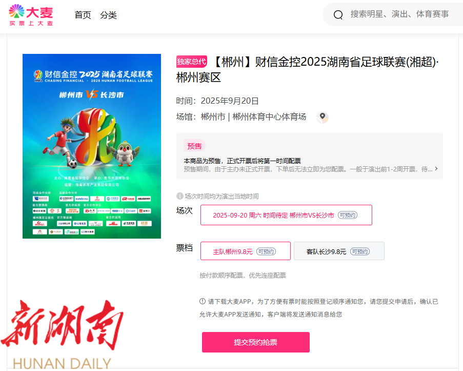 上大麦网抢湘超门票 9月20日郴州队VS长沙队