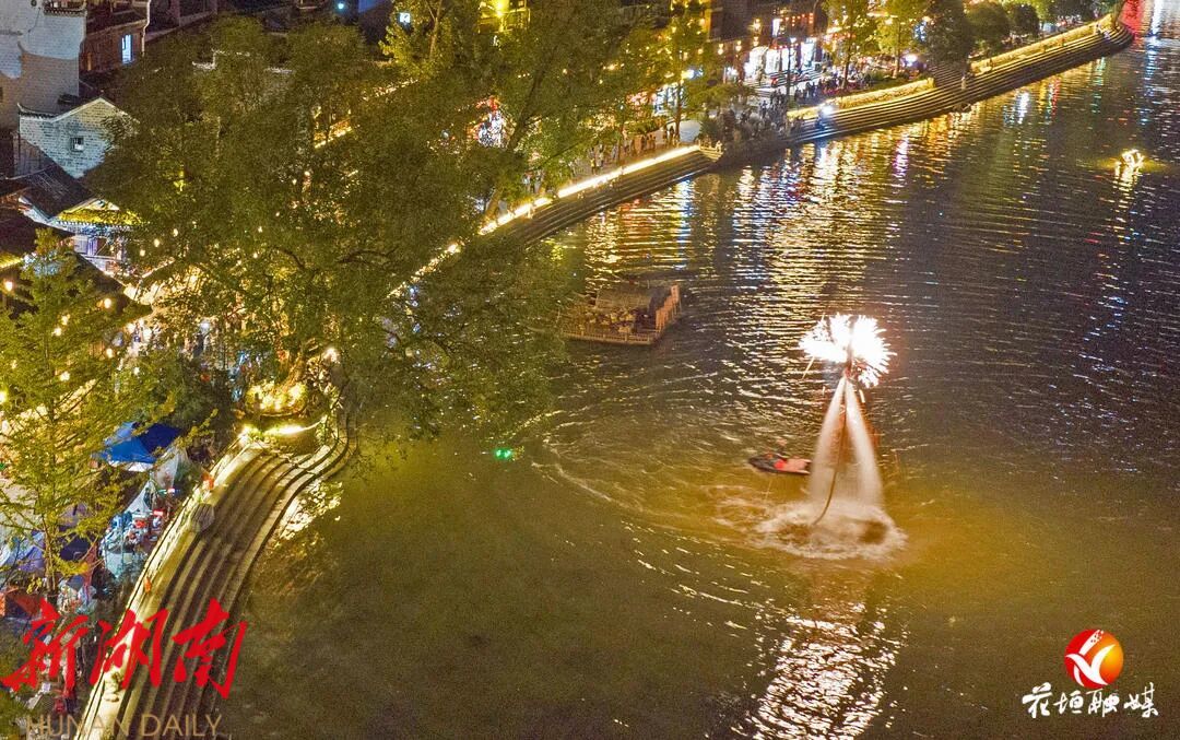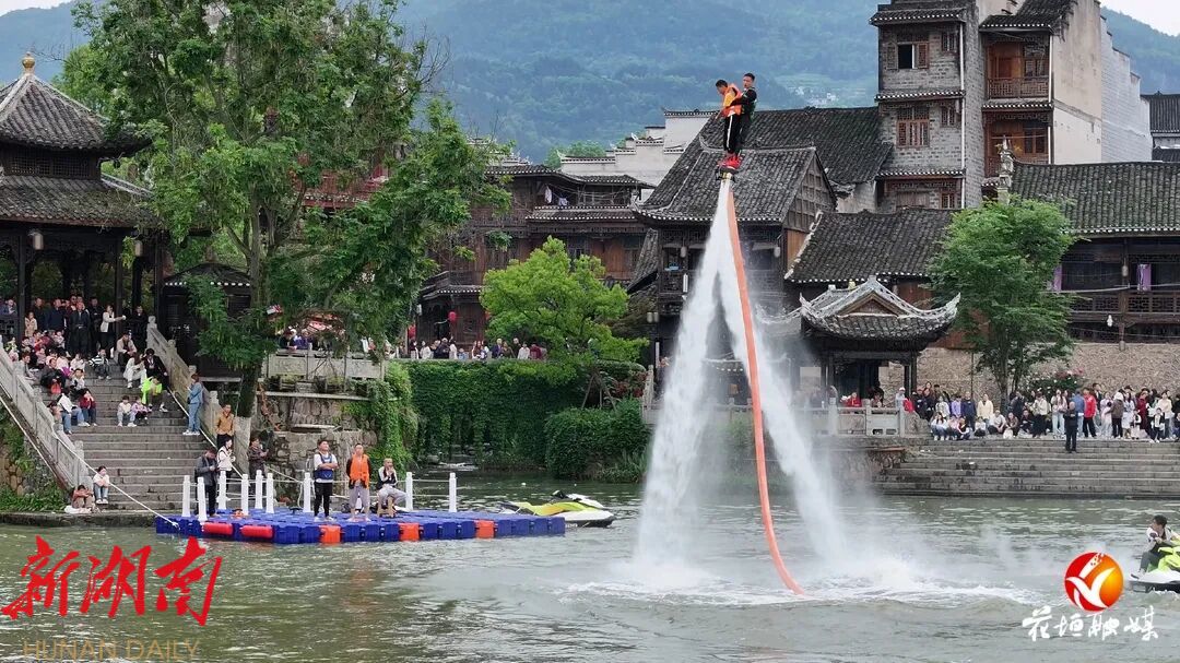 近年来,花垣县深度挖掘沈从文笔下“边城”的文化内涵,积极推动文旅融合,大力培育新兴消费热点。依托清水江的独特水域资源,创新推出以“水上飞人”、“摩托艇”等一批富有体验感和互动性的水上运动项目。并融合非遗表演,推出“非遗水上火壶表演”,为游客带来多层次、多样化的文旅新体验。