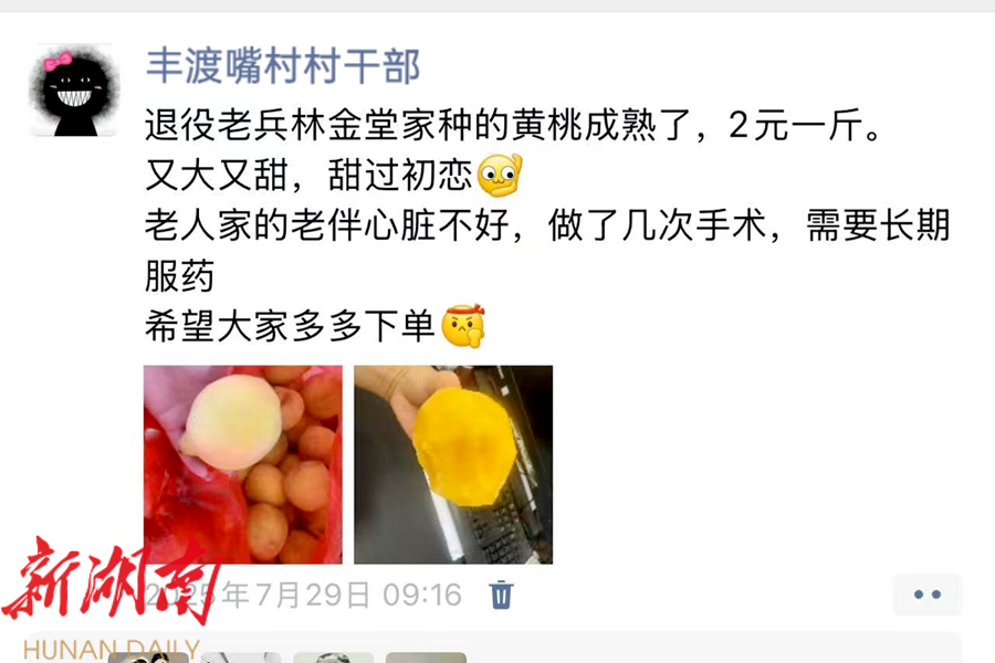 得知情况后,枫树乡丰渡嘴村村“两委”第一时间行动起来。党员干部们直奔果园,挽起袖子采摘黄桃,通过微信朋友圈发起爱心助农倡议:“退役老兵林金堂家种的黄桃成熟了,2元1斤,又大又甜。”一呼百应之下,从县城到常德市区,各地的爱心群众纷纷下单订购,短短数日,滞销黄桃销售一空。这场爱心接力不仅是助农行动,更是党建引领下基层治理温度的生动体现。枫树乡丰渡嘴村村“两委”以实际行动诠释了“党组织是群众的坚强依靠”,彰显了枫树乡党员干部对人民的忠诚与担当。林金堂感动地说:“组织没有忘记我们!这些年党和政府一直关心我们一家。”
