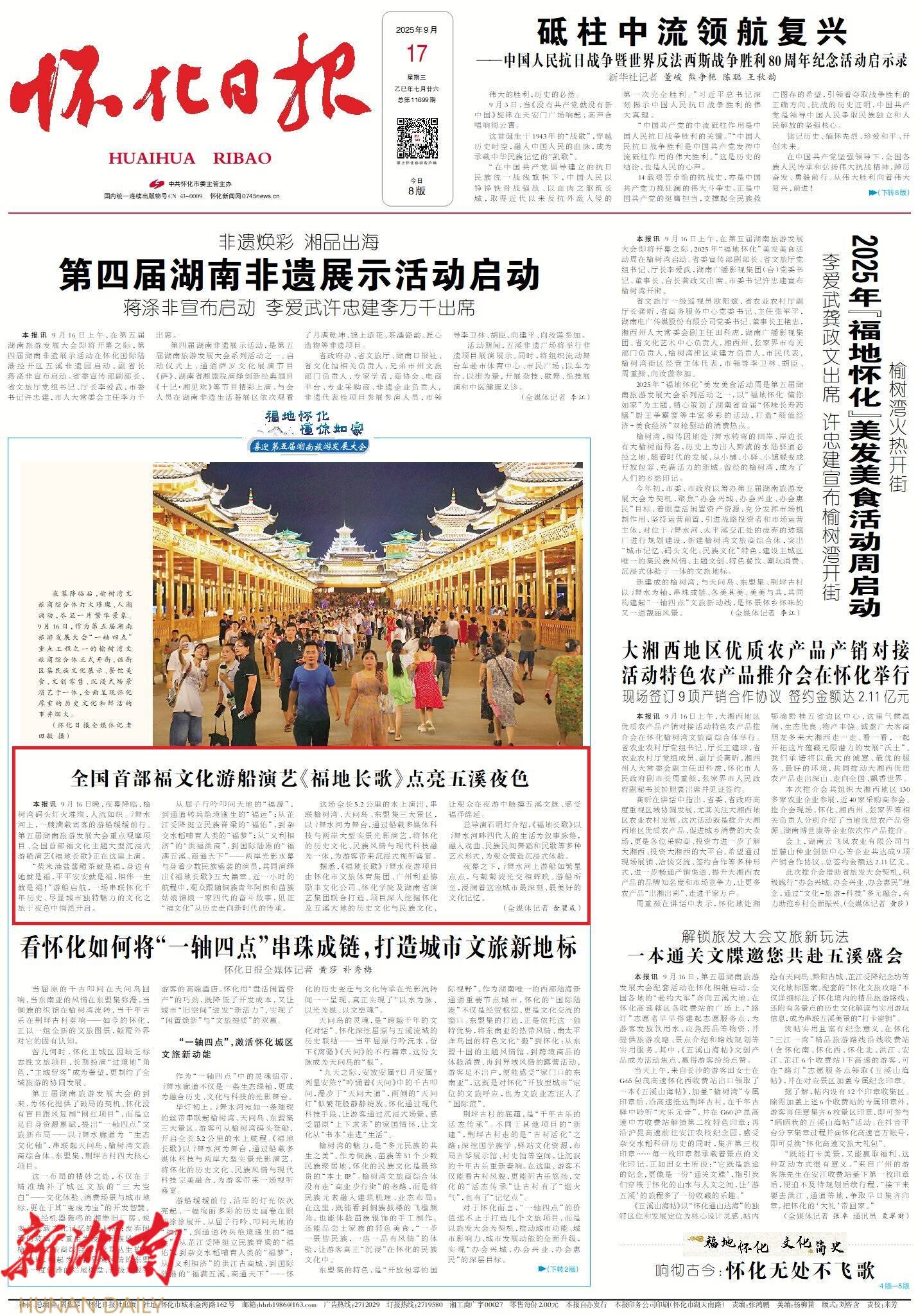 9月16日晚,夜幕降临,榆树湾码头灯火璀璨,人流如织。㵲水河上,一艘满载宾客的游船缓缓前行。第五届湖南旅游发展大会重点观摩项目、全国首部福文化主题大型沉浸式游船演艺《福地长歌》正在这里上演。