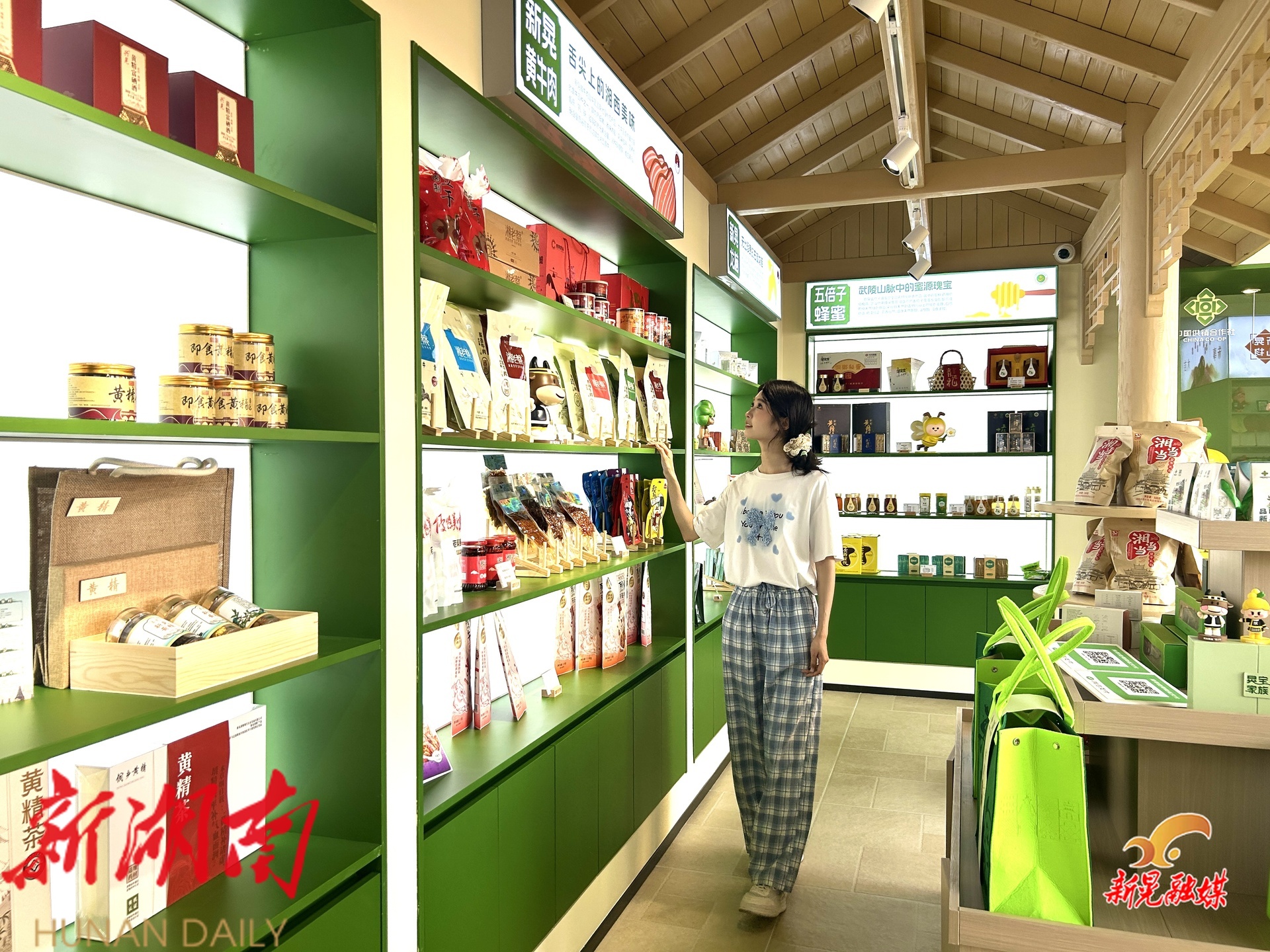 踏入店内,新晃特色产品令人目不暇接。新晃黄精、新晃黄牛肉、新晃龙脑、侗藏红米、五倍子蜂蜜等质优物美,新晃特色IP周边独具创意,“晃茶有方”特色养生茶饮别具风味。店员们正有条不紊地忙碌着,精心制作黄精奶茶,现场热火朝天,处处洋溢着浓郁的新晃风情与活力。