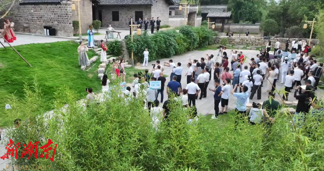 在驿道文化体验馆,嘉宾们借助数字科技重回历史现场,亲身感受古驿道上“策马传书”的紧迫与传奇;步入潘氏宗祠,铜湾镇辰河汉剧团的悠扬唱腔与古朴戏台相映成趣,令人仿佛穿越时空,领略传统戏曲的深厚韵味;在大乐元音广场,嘉宾沉浸于典雅乐器与千年古村形成的和谐对话,余音缭绕,触动心灵;在国乐文化体验馆,嘉宾不仅可聆听讲解,更可亲手体验乐器演奏,感受国乐背后的文化脉搏;还可以漫步于三叠月塘,粼粼水光与精彩演出交织,移步换景之中,尽显荆坪古村文旅融合的生动魅力。