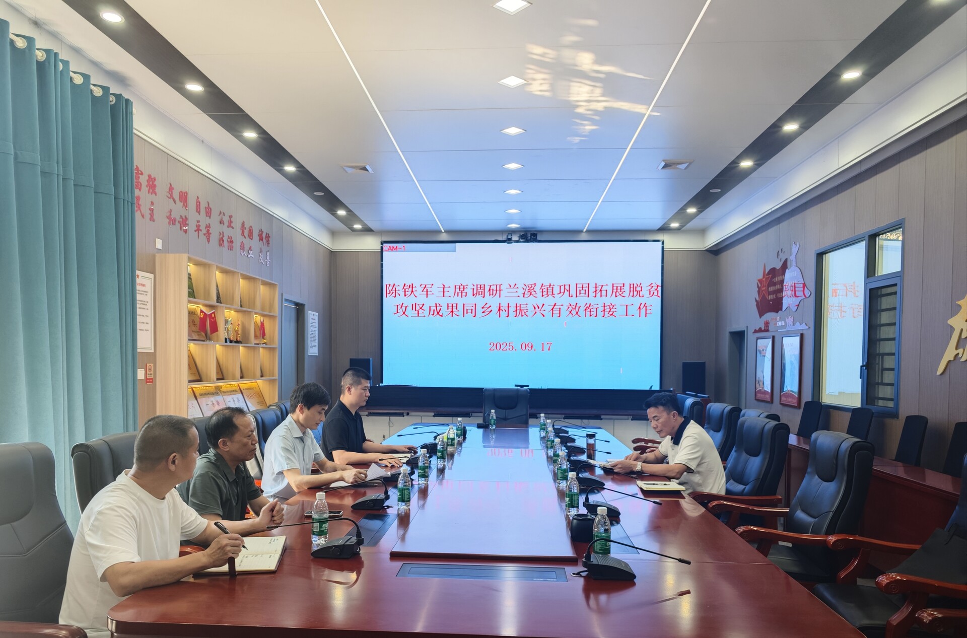 在会议室,陈铁军听取了工作汇报,详细了解了兰溪镇在问题整改、“五问五看”、政策落实等五个方面工作的进展情况,并就工作中的重点难点问题与镇村干部进行了交流讨论。