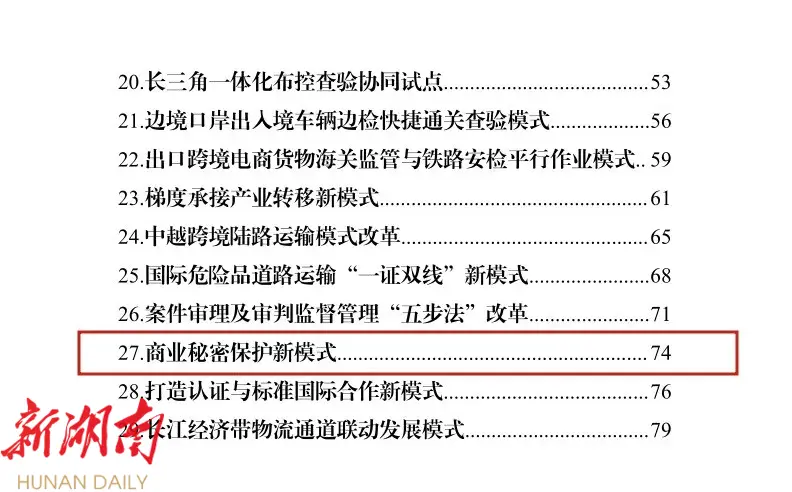 湖南日报·新湖南客户端9月18日讯(长沙经开区工作站记者 欧亚琦)近日,商务部发布自由贸易试验区第六批“最佳实践案例”,中国(湖南)自贸试验区长沙片区——长沙经开区牵头探索的“商业秘密保护新模式”成功入选。这一模式以“前置保护”为核心,把保护关口从“事后举证”前移至“日常留痕”,为企业创新装上“黑匣子”、筑起“防火墙”。