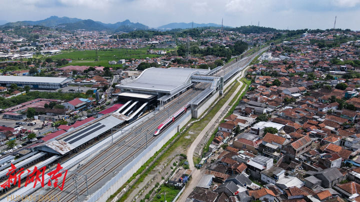 这是2025年5月20日在印度尼西亚帕达拉朗拍摄的雅万高铁列车(无人机照片)。新华社记者 徐钦 摄