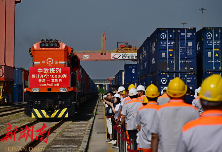 2025年6月10日在山东青岛胶州站拍摄的中欧班列。新华社记者 李紫恒 摄
