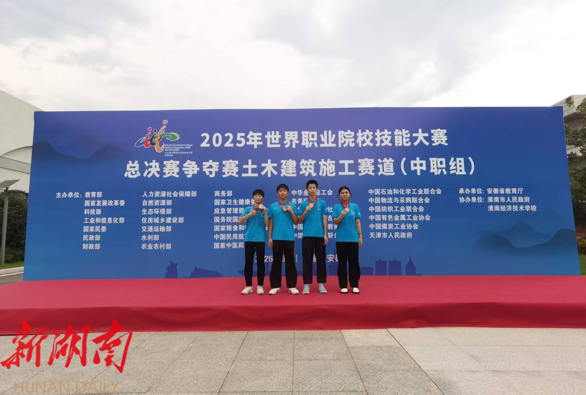 作为职业教育领域最高规格的竞赛平台,世校赛由教育部牵头,联合国家发展改革委、科技部、工业和信息化部等多部门共同主办。赛事覆盖42个赛道,采取三级赛制,吸引全球15个国家参与,以“技炫青春,能创未来”为主题,旨在展示职业学校师生勇于创新的精神风貌,传达友谊、合作、共赢的世界强音,展示职业学校师生勇于创新的精神风貌,传递友谊、合作、共赢的世界强音,践行“促进学生成长成才、引领职业教育发展、助力国际交流合作”的核心定位。湘阴一职建筑班陶轩瑗、戴如洋、戴锦、杨天扩4名学生,在范红辉、倪敏老师的专业指导下,历经层层选拔,过关斩将,成功闯入总决赛。8月29日,代表湖南赴安徽省参赛,在“土木建筑施工”赛道(中职组)总决赛中沉着应战,其获奖作品以装配式建筑为参赛载体,设计新颖前沿,兼具现代科技潮流元素,获得评委高度评价,斩获铜奖。