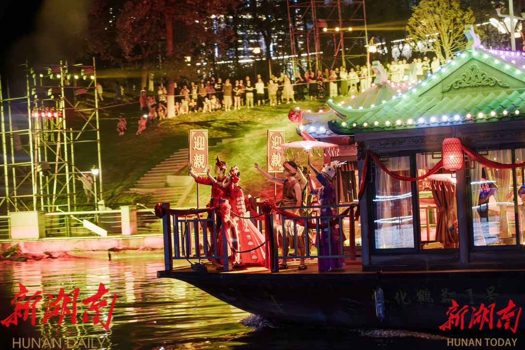 16日晚,全国首部福文化主题大型沉浸式游船演艺《福地长歌》点亮怀化夜色:游船缓缓行,少数民族阿哥阿妹演绎“展卷人”,带领宾客寻福五溪,感悟屈子行吟叩问天地的“福源”、通道转兵绝境逢生的“福运”、芷江受降挺立民族脊梁的“福佑”、杂交水稻哺育人类的“福梦”、“义利相济”的“洪福洪商”以及国际陆港的“福满五溪、商通天下”。