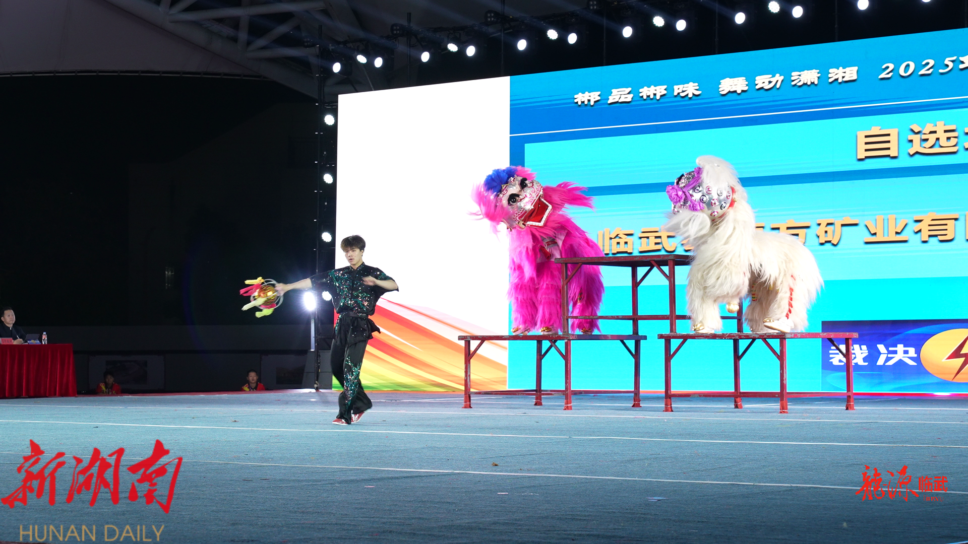 赛场上,各支队伍轮番登场,将龙狮文化中 “力” 与 “美” 的融合展现得淋漓尽致。色彩绚丽的巨龙,在队员们默契十足的配合下,时而昂首摆尾如出海蛟龙,时而穿梭腾跃似穿云祥龙,恢弘气势与精湛技艺交织;另一边,腾挪闪转的醒狮,在梅花高桩上轻盈跳跃,惊险的高空采青引得现场观众连连惊叹。本次比赛涵盖舞龙、南狮、北狮等多个竞赛项目。不仅考验传统套路的纯熟度,更在自选创新环节鼓励各队融入地方特色与现代元素,展现湖湘龙狮文化的蓬勃生机与无限创意。