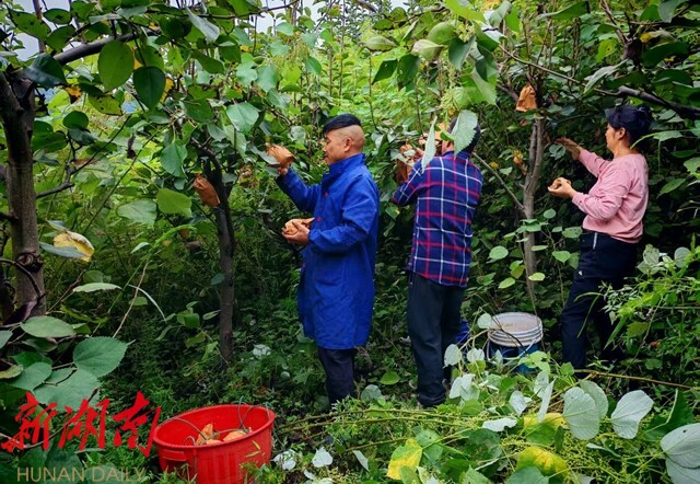 湖南日报·新湖南客户端9月21日讯(通讯员 曹向潮 曾振科)9月20日,新化县石冲口镇曾家湾中民家庭农场金果梨开园采摘,吸引周边游客前来采摘、购买。