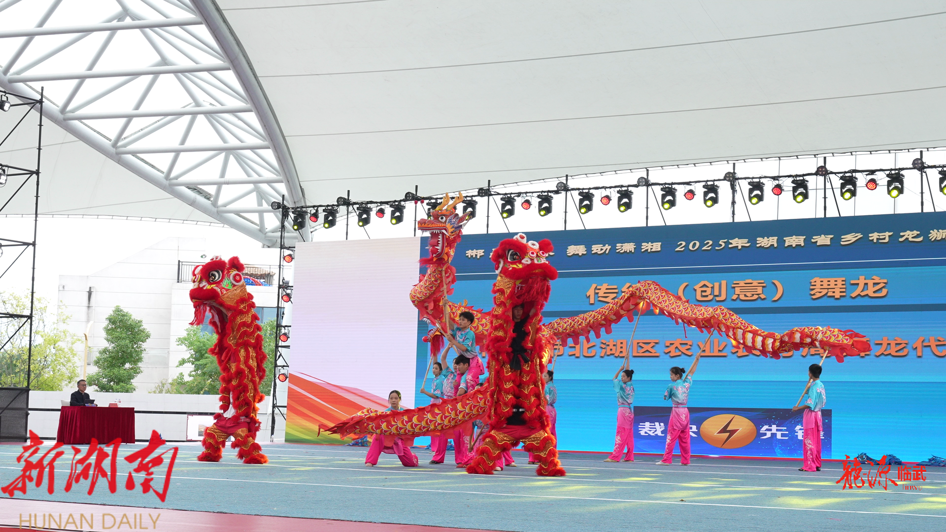 赛场上,锣鼓喧天,龙腾狮跃。巨龙与醒狮轮番登场,掀起阵阵热潮。来自郴州市北湖区农业农村局舞龙代表队,凭借一套彩带龙绝技惊艳全场。这支由16名平均年龄仅16至17岁的青少年组成的队伍,大胆突破传统框架,将武术的刚劲、舞狮的灵动与彩带龙的飘逸巧妙融合,编排出极具创意的表演,传统龙狮技艺与现代创意编排的碰撞,让现场观众眼前一亮,成为赛场上一道亮丽的风景线。